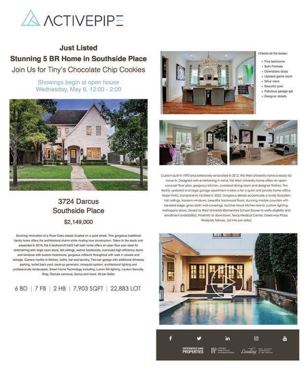 Greenwood King Properties utilizes a multitude of digital media to market your property. This includes ActivePipe, PaperCity Online, Adwerx, Facebook, Instagram and more. These advertising efforts aim to highlight your property with the use of colorful, professional photos and beautiful layout. All digital creatives are mobile responsive, comprises of property details, video links and call-to-action pages. The goal is to identify and engage prospective buyers in our market areas, providing unprecedented exposure to a global audience.