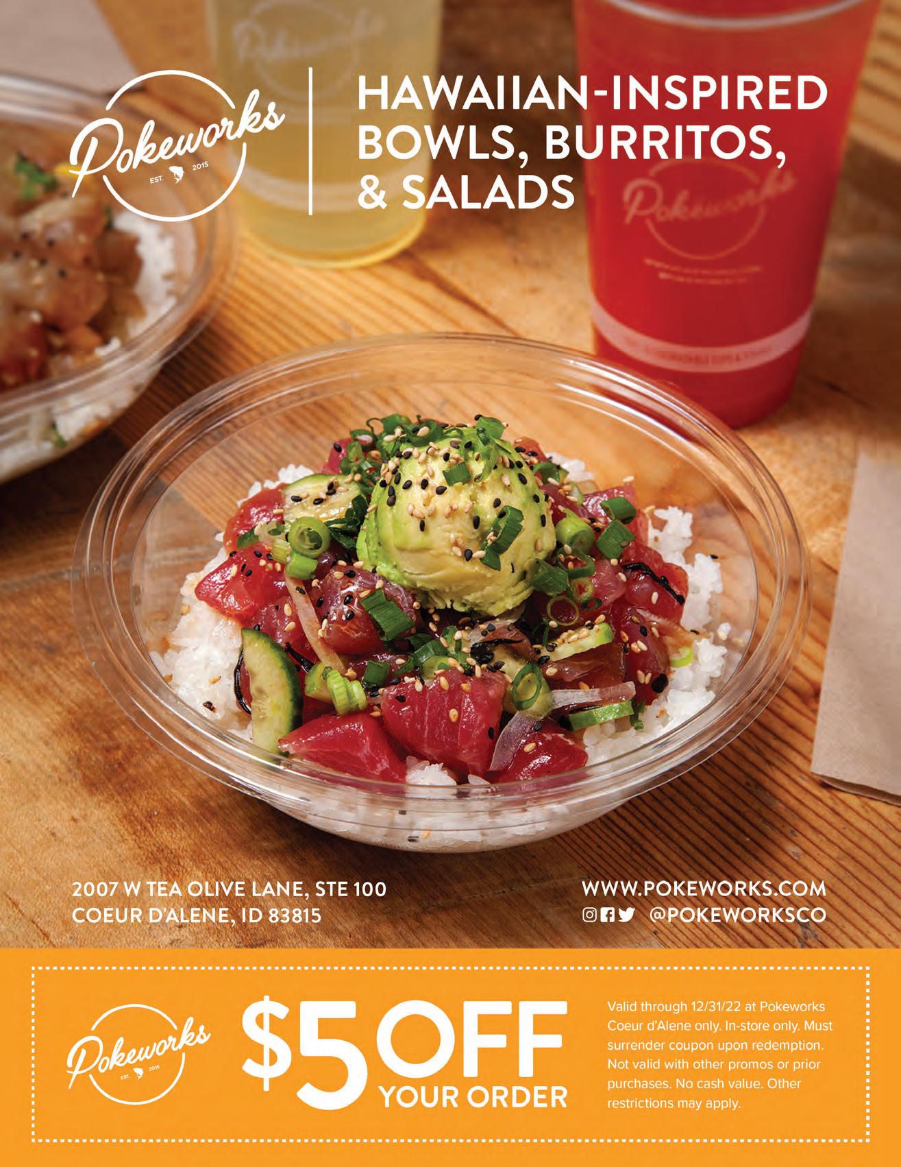 Valid through 5/1/23 - 12/31/23 at Pokeworks Coeur d’Alene only. In store only. Must surrender coupon upon redemption. Not valid with other promos or prior purchases. No cash value. Other restrictions may apply.
