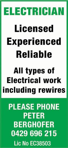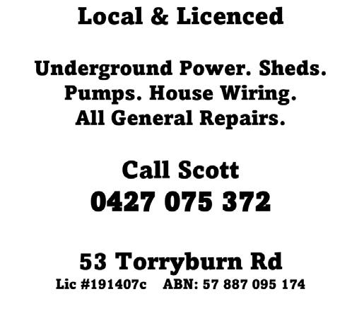 Like us on Facebook “Support your Club, It’s your club” Best In our town Are you in need of an Electrician? Maybe you need some Excavation work done, Even just a load of soil or gravel. Please call Gregg, local reliable and trustworthy Ph. 0429389473 www.merchantindustries.com.au Lic No: 296114c ABN: 96 611 109 972