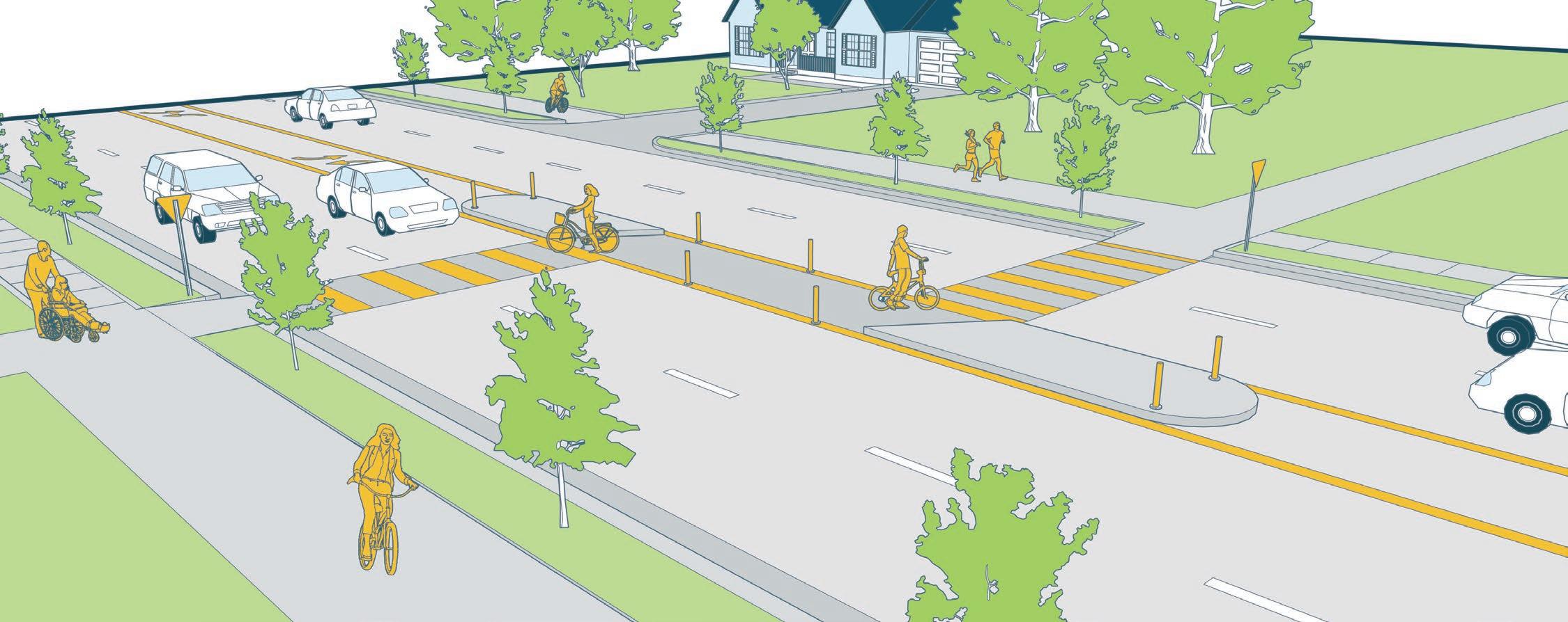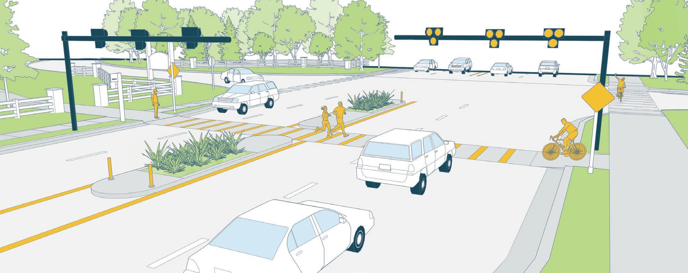The following illustrations demonstrate how different pedestrian safety features could be implemented along the Baltic Creek Greenway. There are three categories of road treatment represented. The pedestrian underpass, which separates a pedestrian route from a roadway by grade and will allow for the continuous flow of cyclist traffic along the greenway. The High Intensity Activated Crosswalk (HAWK), a crosswalk effective even on streets with multiple lanes and high speeds that allows pedestrians to activate lights signaling their intent to cross the road. Finally, the staggered midblock crosswalk, which encourages pedestrians to check oncoming traffic from the safety of a median at the midpoint of the crosswalk.