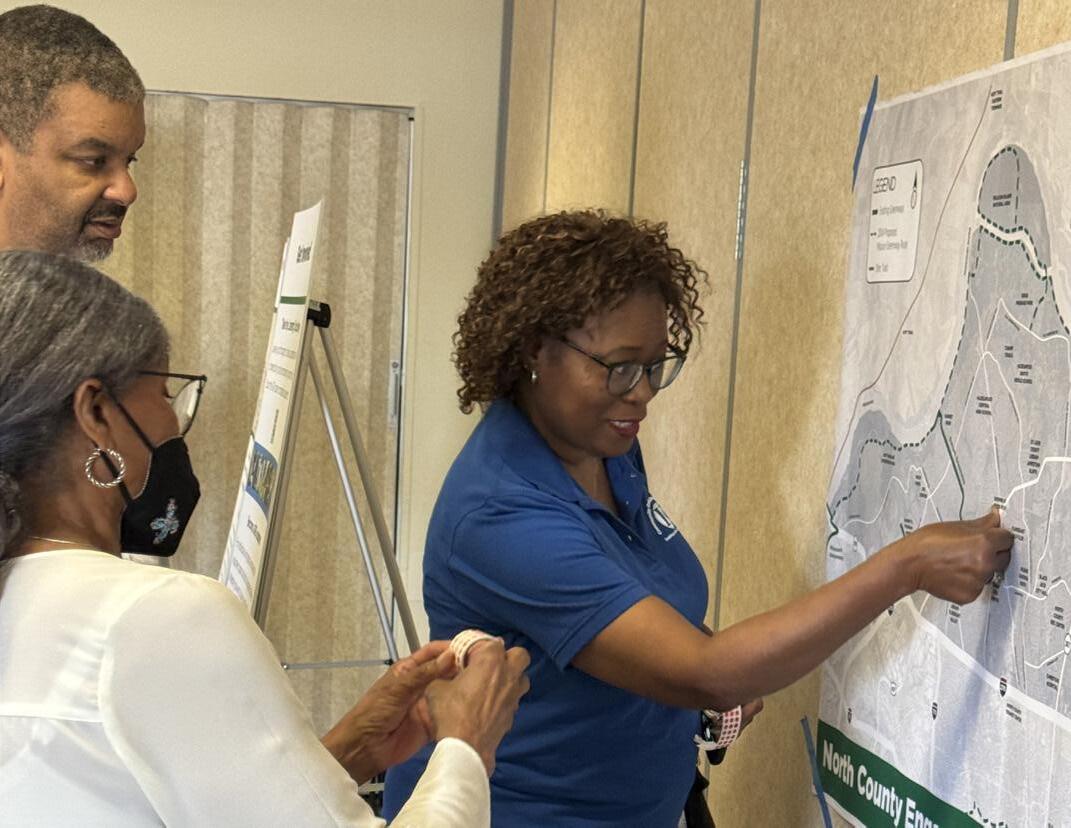 Project Manager Michael Steinlage reviews options for the greenway route with residents and elected officials in Ferguson at an engagement event in Forestwood Park. After rounds of revisions, construction begins soon.