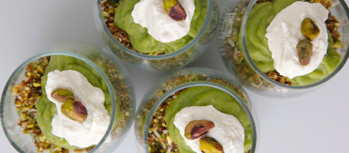 2. For each serving, use a clear glass or parfait dish. Layer vanilla Greek yogurt, then mint avocado cream, and top with dark chocolate or pistachios. Repeat the layering process until the glass is filled to the desired level.