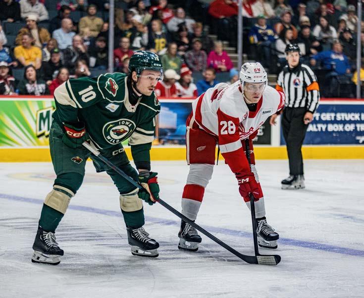 Carson Lambos is the lone first-round selection from the Minnesota Wild on Iowa’s roster. Lambos, a thirdyear pro, was chosen with the 26th overall pick by the Wild in the 2021 NHL Entry Draft. At the Christmas break, he had a mere five points (2-3—5) in 27 games with Iowa. The 22-year-old made his NHL debut with Minnesota on Dec. 18, 2025, at the Columbus Blue Jackets and posted a plus-one rating. In his previous two seasons with Iowa (2023-25), Lambos registered 33 points (9-24—33), 107 penalty minutes, and a minus-eight rating in 137 outings.