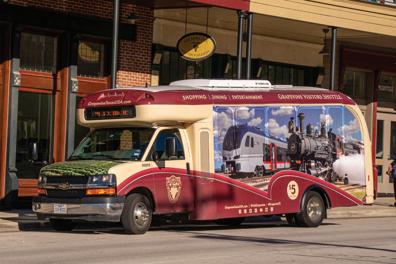Trinity Metro TEXRail travels 27 miles, including through Grapevine, with a stop at the 42,000-square-foot Grapevine Main Station. The Grapevine Visitors Center is located here. The 1930s-inspired Grapevine Visitors Shuttle runs Wednesday through Saturday from 11 a.m. to 9 p.m. and on Sunday from 11 a.m. to 7 p.m. This complimentary shuttle makes stops at the Historic Main Street District, Grapevine Mills, DFW International Airport and a host of restaurants and hotels. Shuttle schedules are subject to change, so make sure to check the website for up-to-date schedules and information.