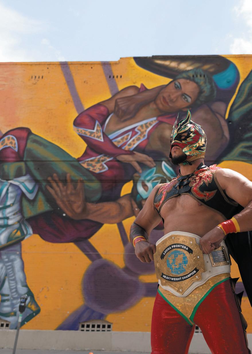 A LUCHADOR STRIKES A POSE IN FRONT OF A LUCHA LIBRE MURAL.