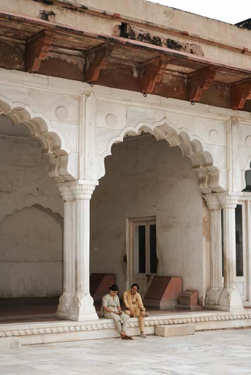 This photo was taken at Agra Fort in Agra, India which looks out on the Taj Mahal. Pictured are two women in traditional dress resting below a small part of the stunning marble architecture of the fort, built in the late 1500s. It is a popular destination for travelers from all over India and the rest of the world.- Lucy
