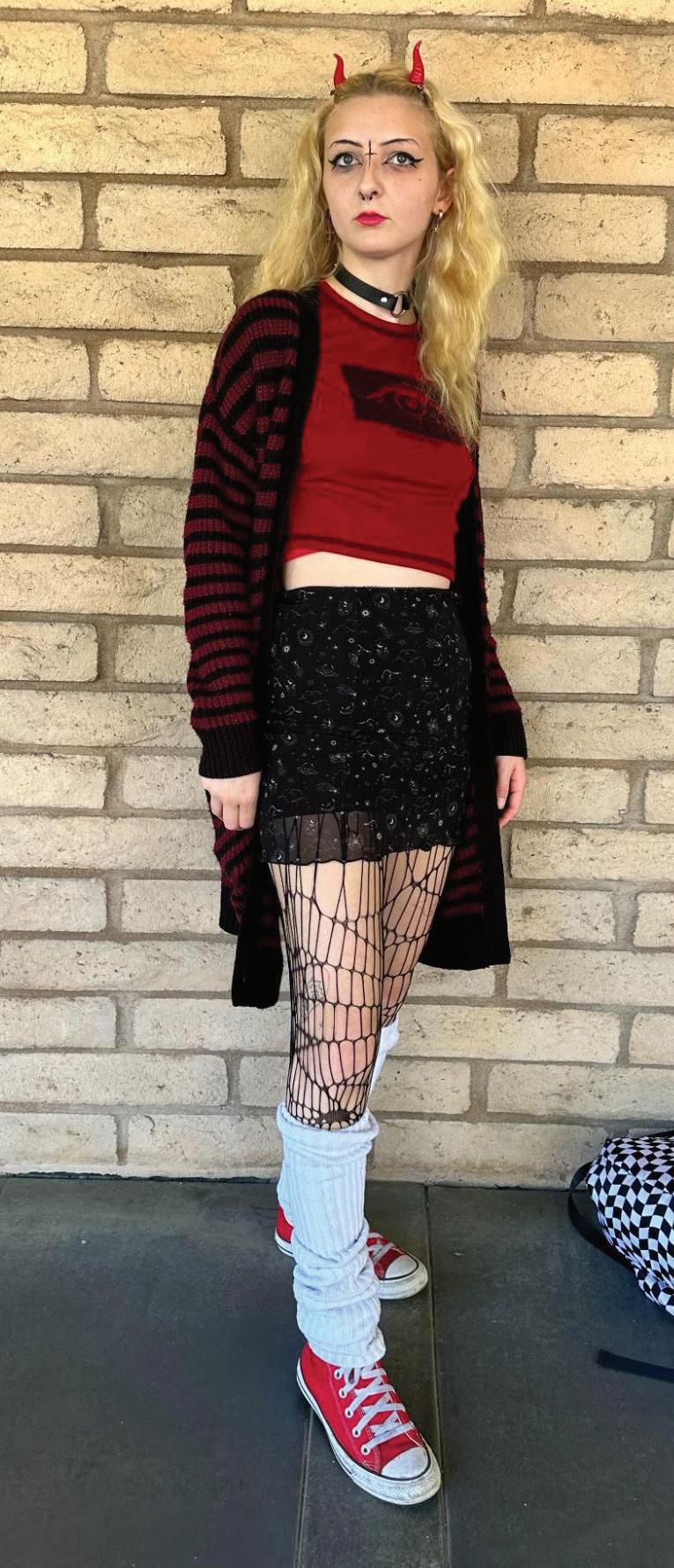 On the way to a The Rose concert, Shayla has a perfectly on theme look for both the band and the weather. In the early October heat, Shayla doesn’t forfeit the fall vibes in her on-themed outfit. Lace layering pieces with a target summer dress, she is following the autumn trends while adapting to Santa Cruz weather. Tying in a component in multiple places in an outfit can create a more cohesive look as we see in Shayla’s choice of lace on lace and blue socks and dress. Shayla tells me exploring style doesn’t have to be expensive, you can attempt new combinations. You don’t need a whole new wardrobe to keep up with the trends, you can repurpose pieces to stay in style.