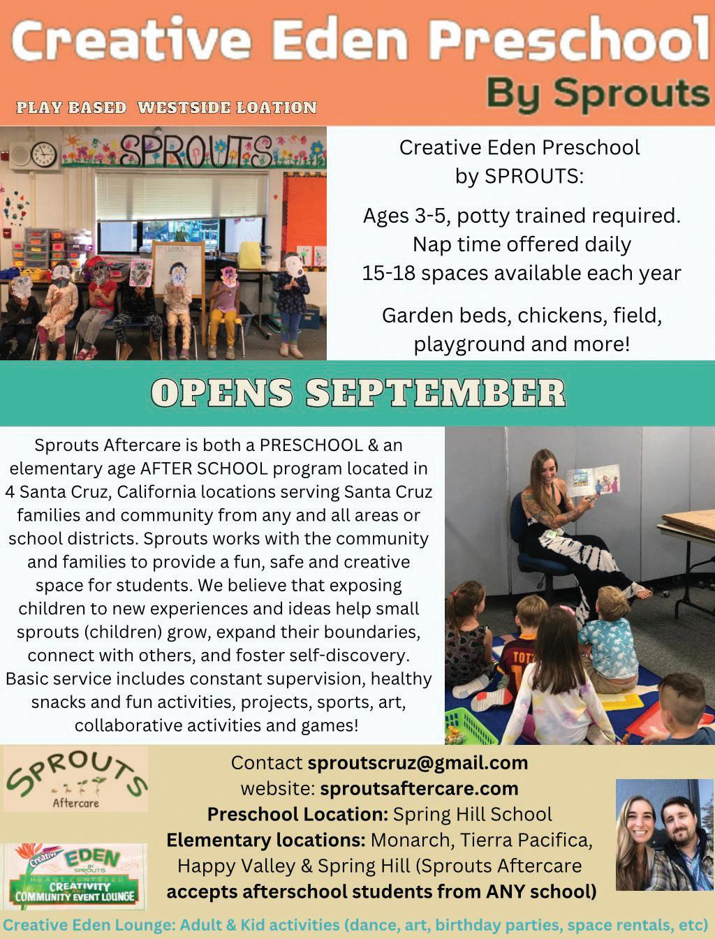 831-425-0519 santacruzwaldorf.org Register today for Preschool & Kinder tours! Introduction to Waldorf Early Childhood Saturdays this fall 9-10:30am Oct 7 • Nov 4 • Dec 2 Accepting students in all grades. Call to schedule a tour. Parent Child Classes begin Sept 29th Register today! SEVEN DIRECTIONS • Wide selection of classes and camps for ages 5 and up! • Visual & performing arts, sciences and more! • Homeschool and after-school programs • Lively 2,000 sq ft studio • 35+ live exotic animals sevendirections.org (831) 713-9392 sevendirectionsinfo@gmail.com Santa Cruz’s Premier Creative Center for Kids!