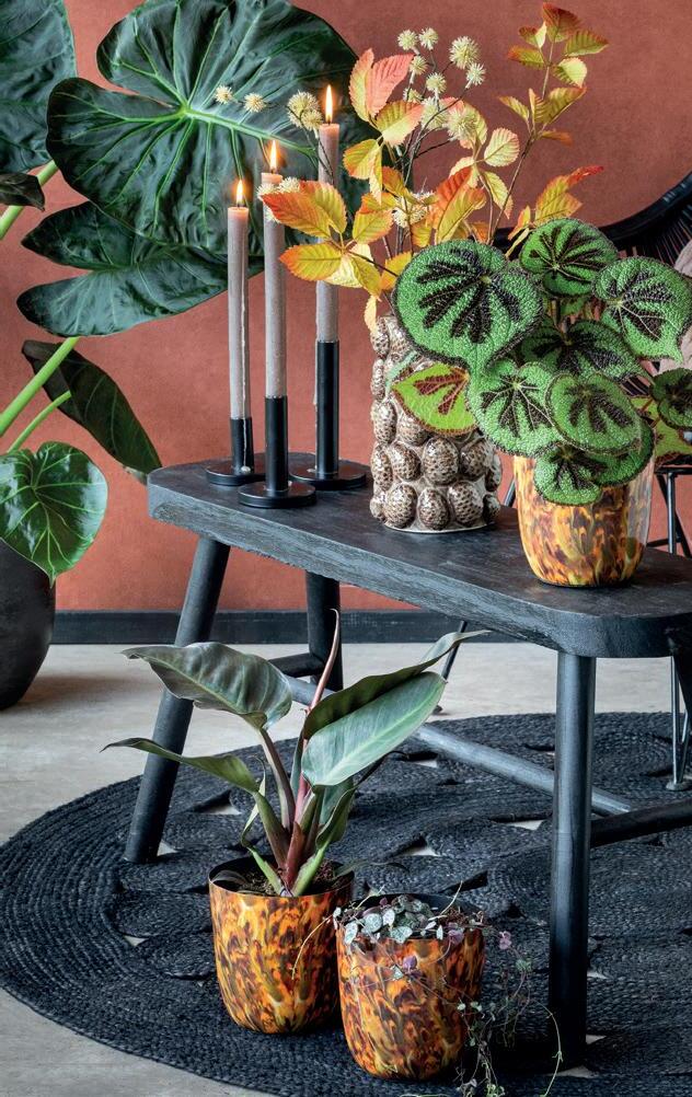 Natuurlijk kunnen planten niet ontbreken in deze trend, zoals de Begonia masoniana 'Mountain' met haar bijzondere dieprode tekening op het blad. De haartjes op het blad zorgen voor een unieke uitstraling.