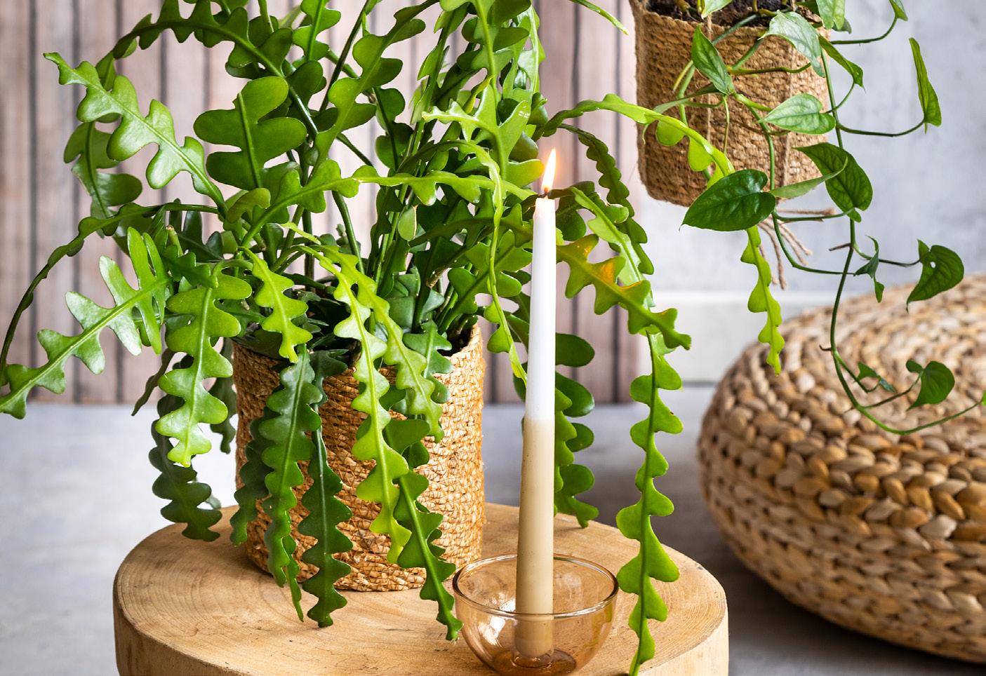 2. Paradijsvogelplant . P. 27 cm, H. ca. 140 cm. Strelitzia nicolai. Excl. mand. 79,95 59,95 4. Plantenkrukje . Dia. 24 cm, H. 25 cm. Hout. Keuze uit een vierkante of ronde vorm 5. Krokodillenvaren . P. 12 cm, H. 30 cm. Microsorum mussifoliurum mussifolium ‘Crocodyllus’. Excl. sierpot. 6. Hertshoornvaren . P. 17 cm, H. ca. 40 cm. Platycerium bifurcatum in hangpot. Excl. sierpot.