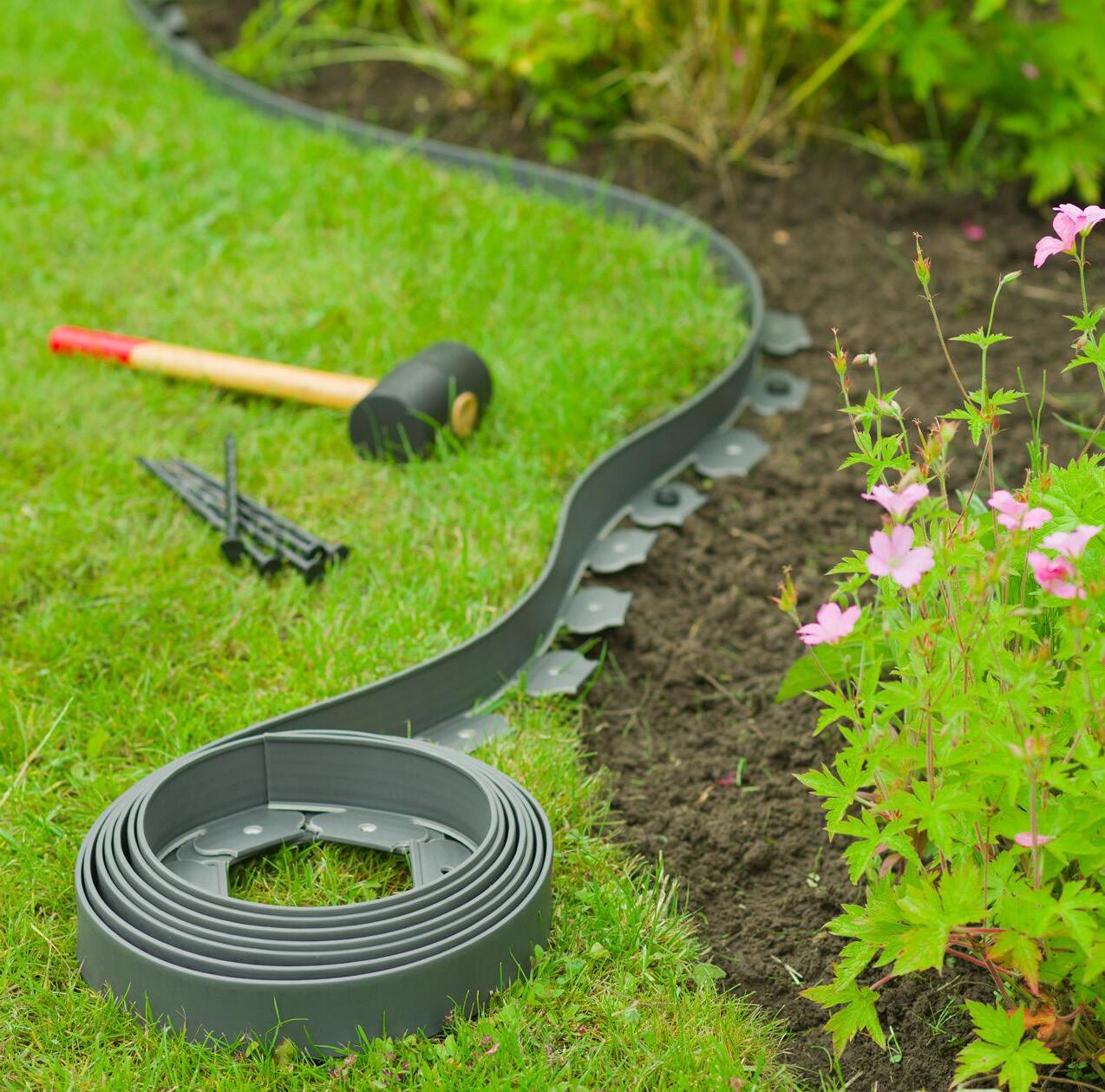 Hoogte 5 cm, lengte 10 m. Grijs. Flexibele, kunststof rand. Ideaal om borders mee aan te leggen. Zakje van 10 borderpennen apart verkrijgbaar