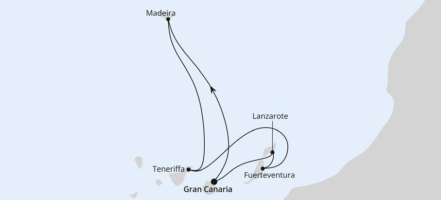 Route: • Gran Canaria • Madeira • Teneriffa • Fuerteventura • Lanzarote • Gran Canaria