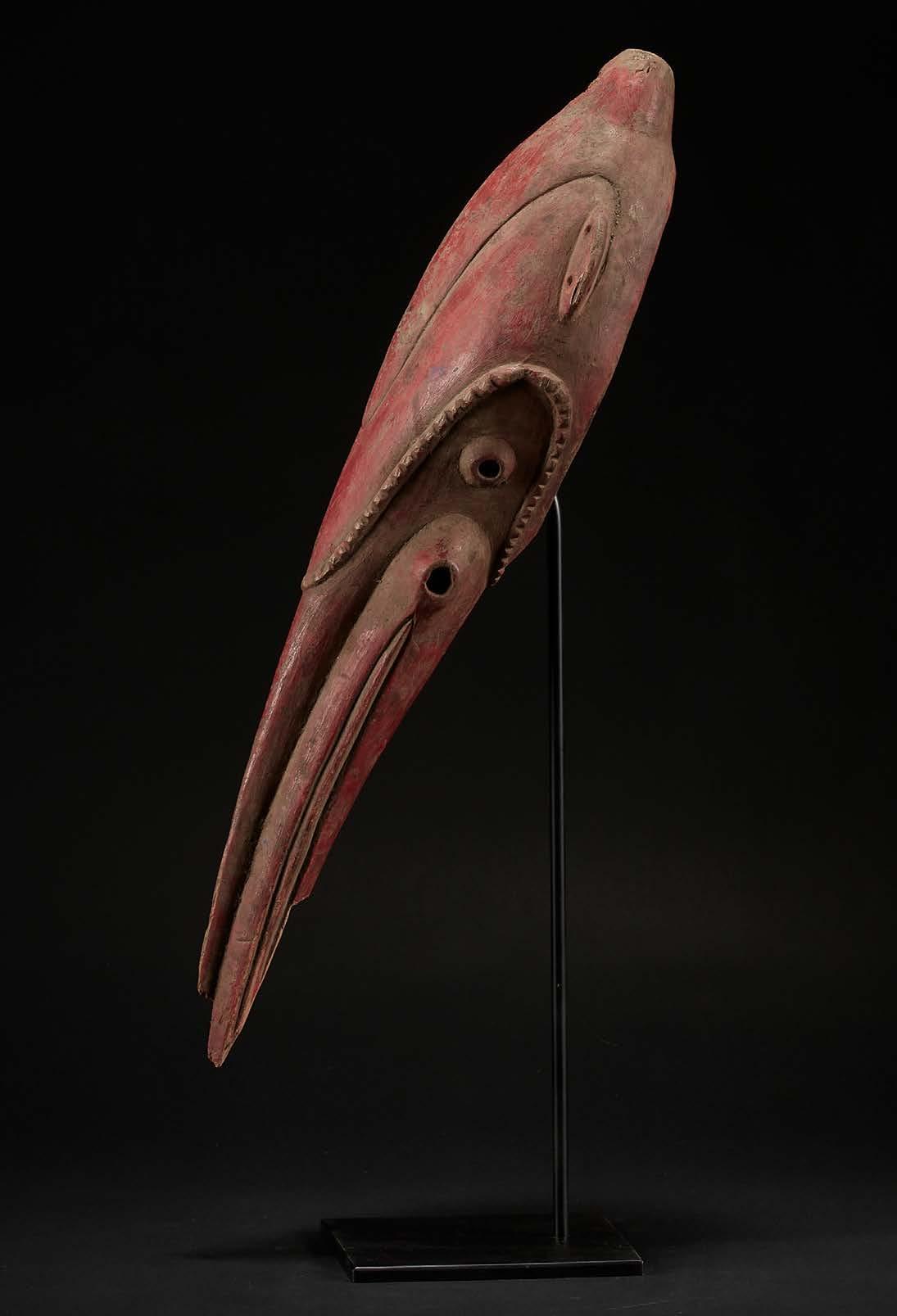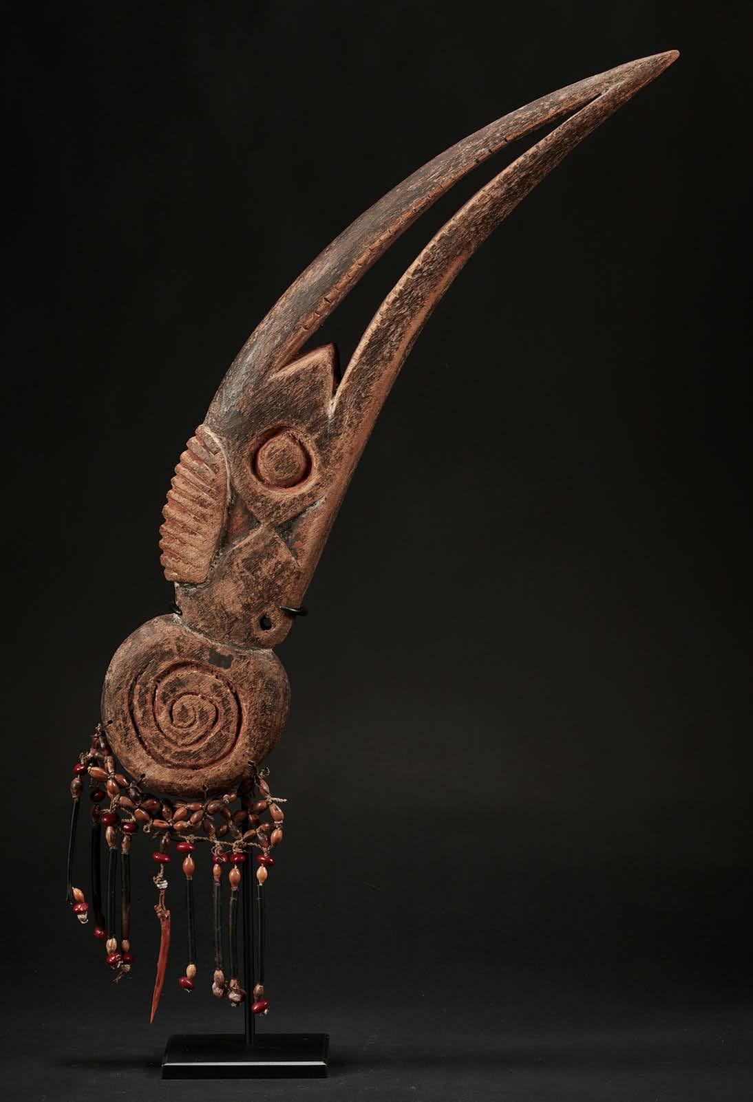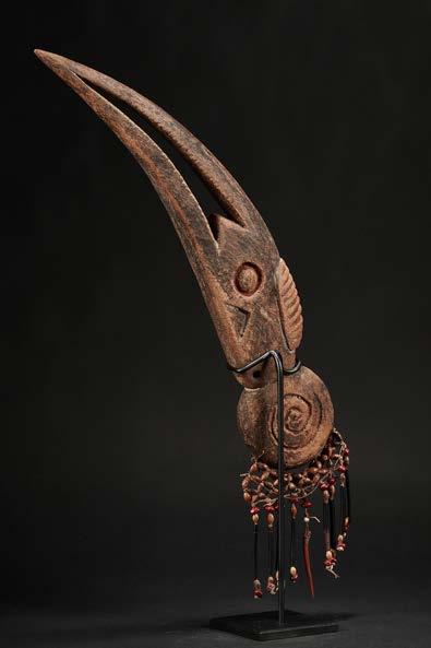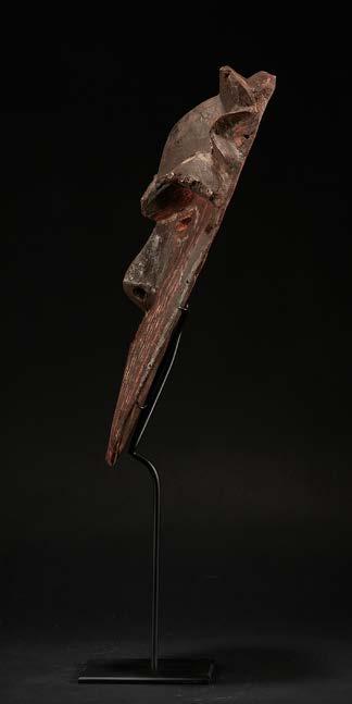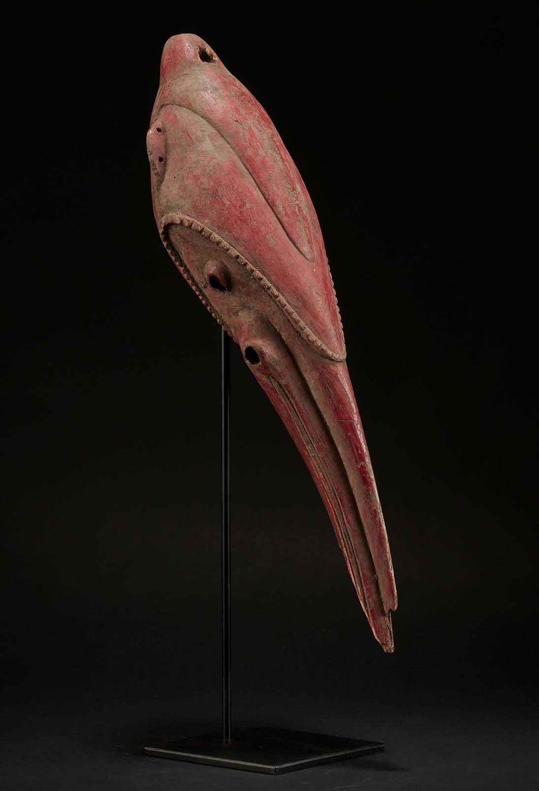 This Bird Mask, representing a clan bird totem, is one of the more elegant masks to come from this little-known region. Its form is long and sinuous and shows evidence of being used over many years. The end of the pointed beak is slightly damaged, a sign of its frequency of use, but this does not detract in the least from its overall aesthetic quality. Totem masks of this kind were worn during ceremonial dances. The male dancer wears this over his face, with his body totally covered by fibre skirts. The exact nature of the ceremony for which this mask was danced is unknown, yet it clearly displays a ceremonial vitality.