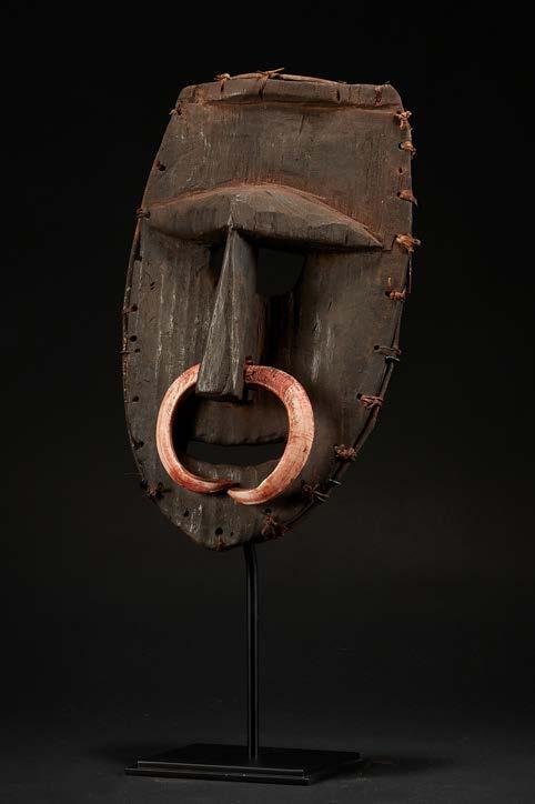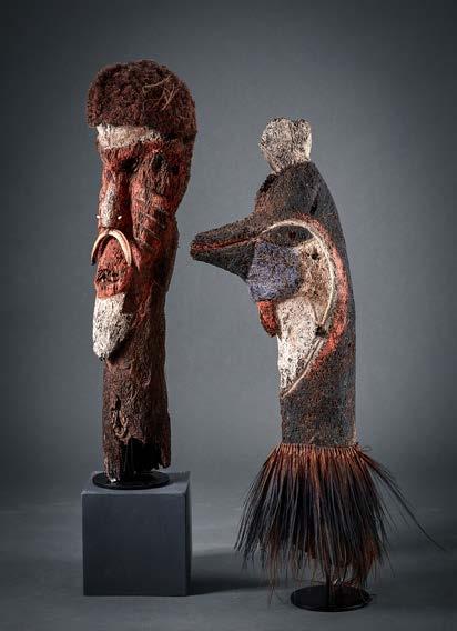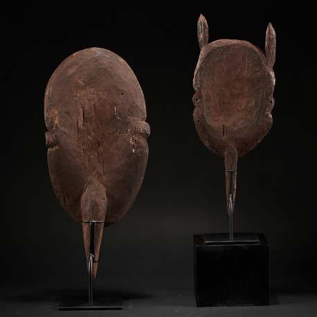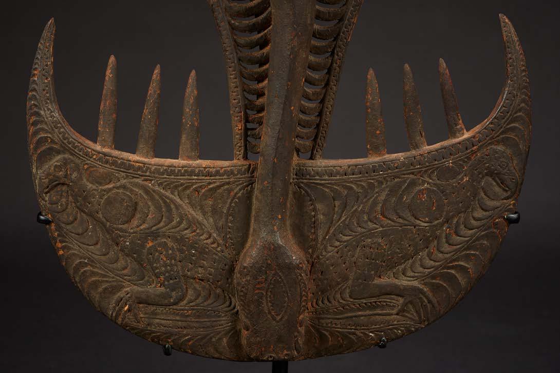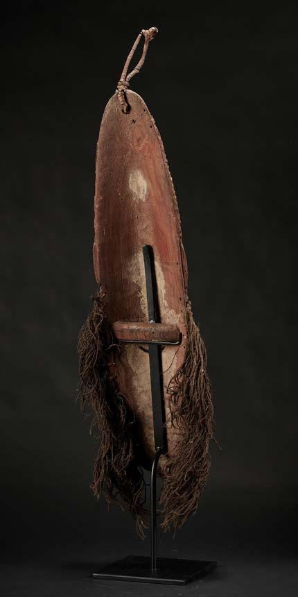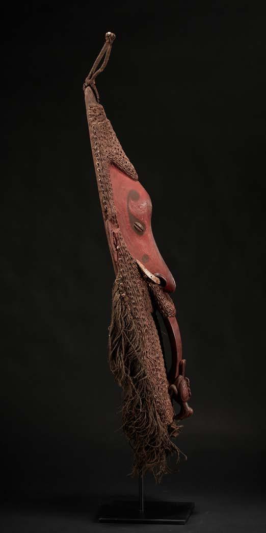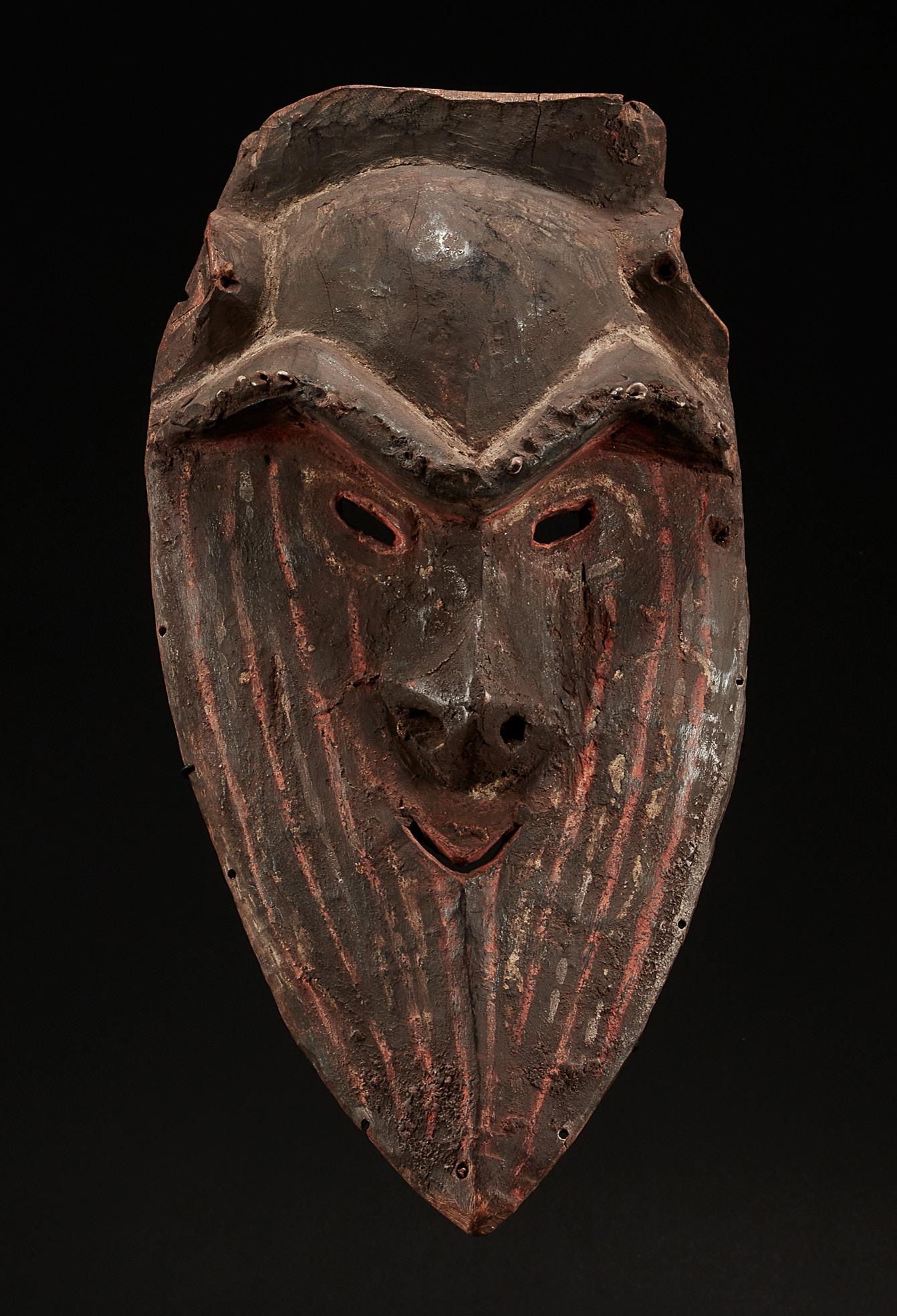 This Bird Mask, representing a clan bird totem, is one of the more elegant masks to come from this little-known region. Its form is long and sinuous and shows evidence of being used over many years. The end of the pointed beak is slightly damaged, a sign of its frequency of use, but this does not detract in the least from its overall aesthetic quality. Totem masks of this kind were worn during ceremonial dances. The male dancer wears this over his face, with his body totally covered by fibre skirts. The exact nature of the ceremony for which this mask was danced is unknown, yet it clearly displays a ceremonial vitality.