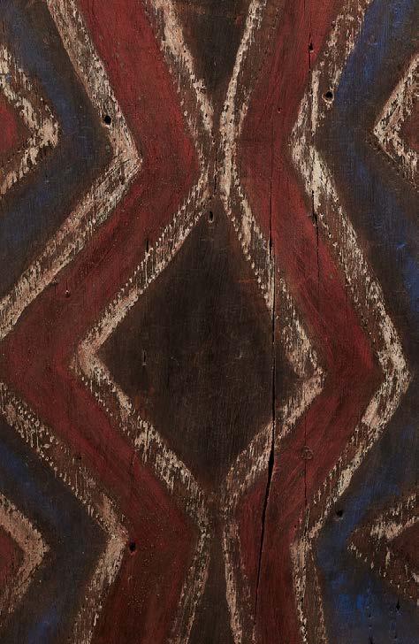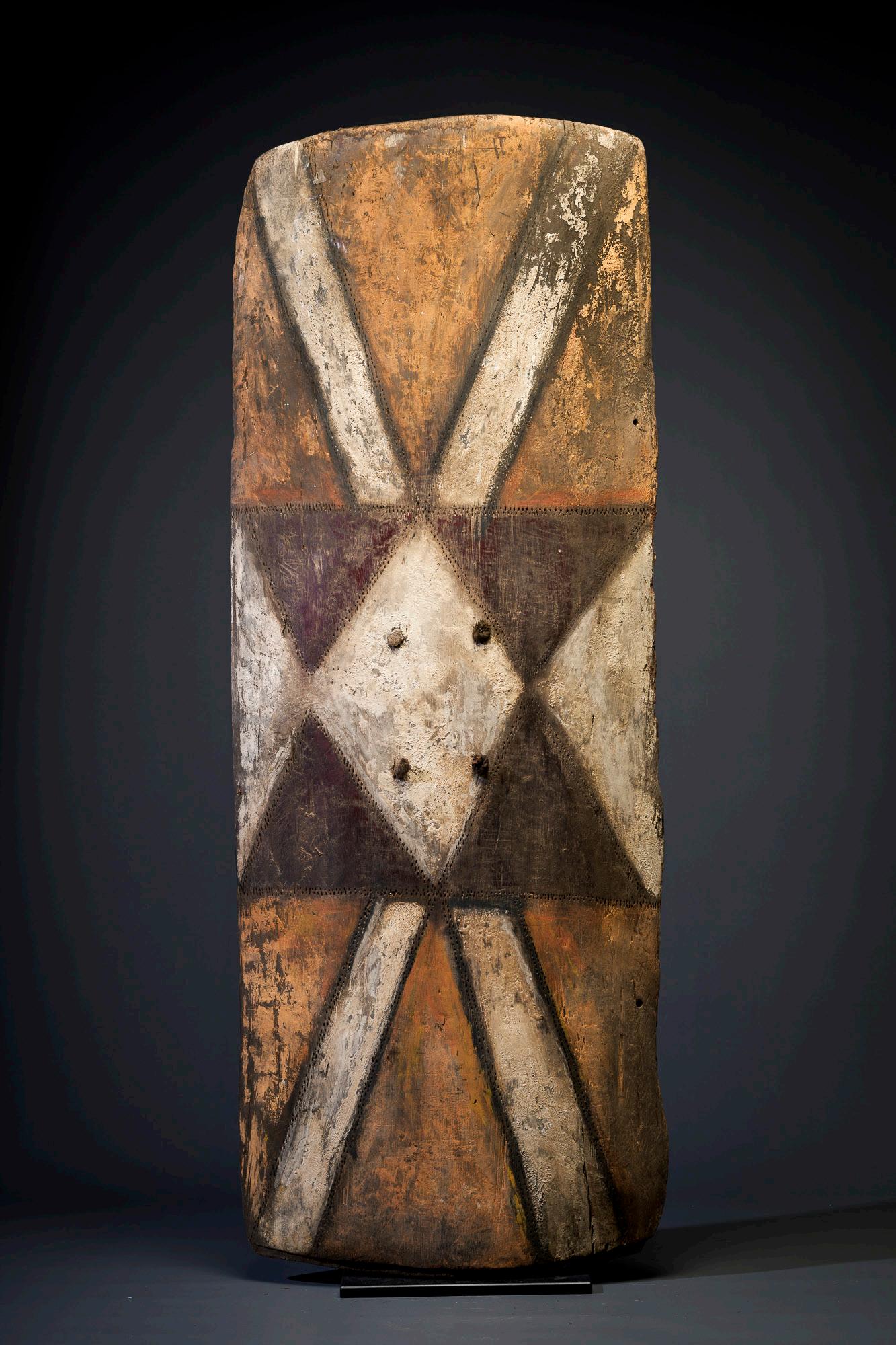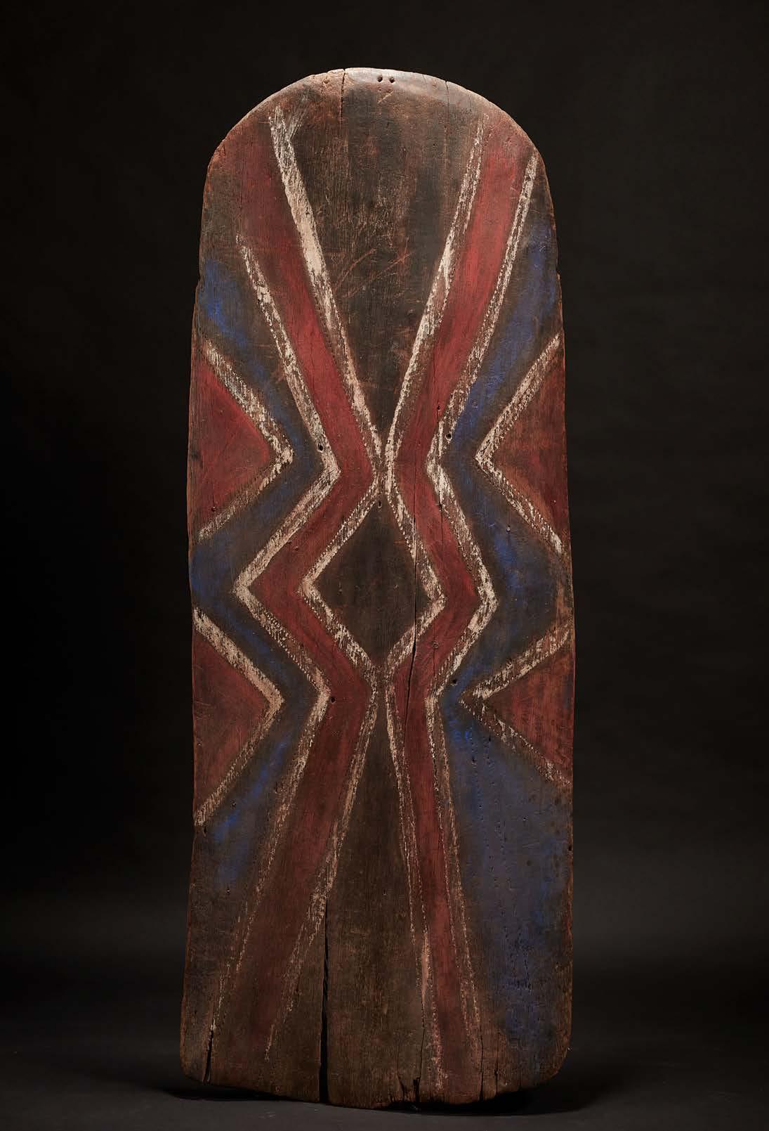 The zig-zag vertical design motifs are defined by small holes, punctuated into the smooth surface of the shield. At the centre is a red diamond form from which the white zig-zag lines radiate to suggest a highly stylized anthropomorphic figure. Essentially the design symbolises a man, with the red diamond being the “navel”, and the radiating lines evoke outstretched limbs. This figure is believed to represent an ancestor, possibly an ancestor who died in battle, who will protect the shield carrier, and also to exact revenge upon the enemy.