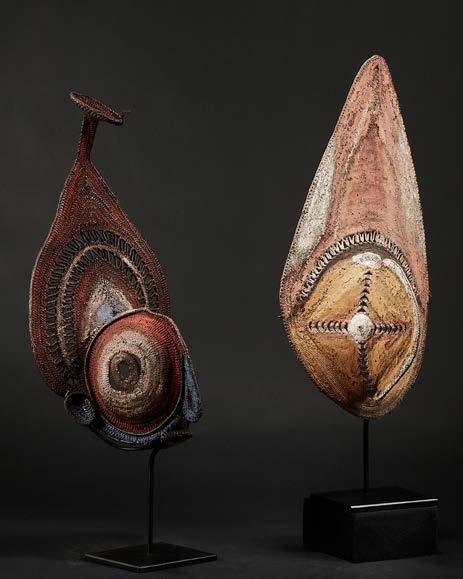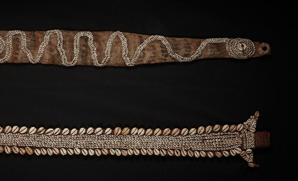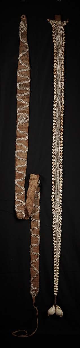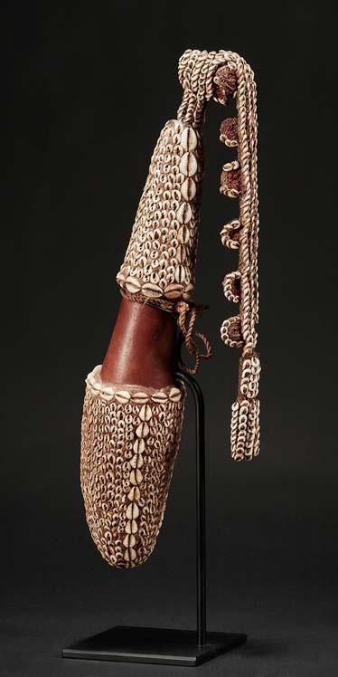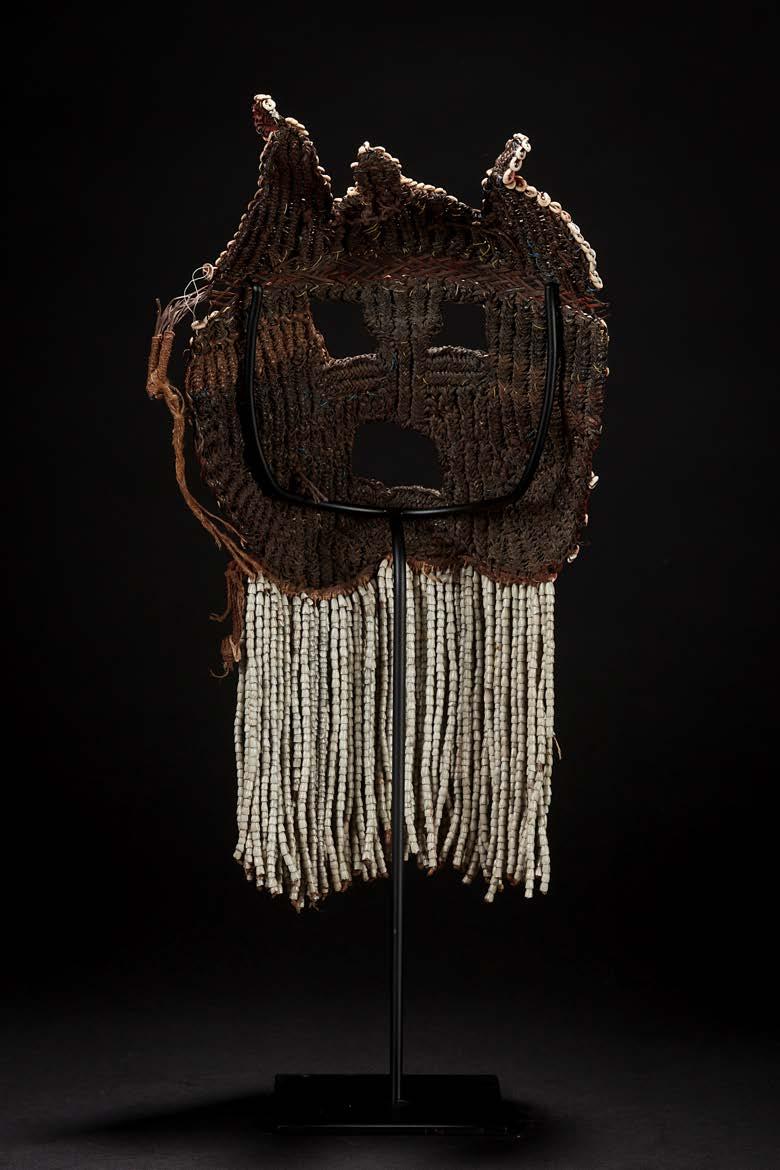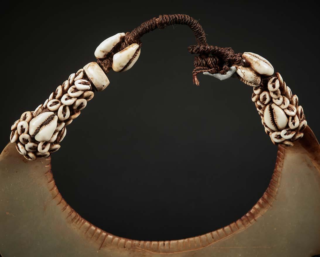 a) Kina, Crescent-Shaped Pearlshell Necklace, Iatmul people, Middle Sepik River. This exquisite kina shell necklace, nyau in the Iatmul language, is among the finest examples known. The woven sections are meticulously executed and adorned with cowrie, nassa and conus shell. Most unusually the upper and lower edges of the pearlshell are engraved – a rare feature, as these are typically left unmarked – indicating the necklace’s exceptional value. Kina shells were used always at important ceremonial gatherings but, most importantly, worn by a bride at her wedding.