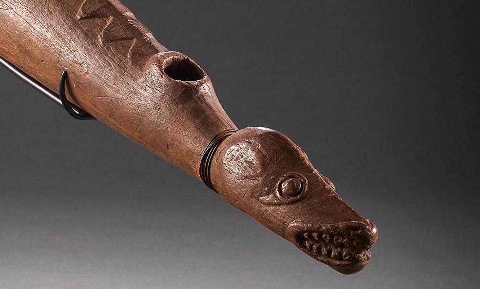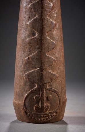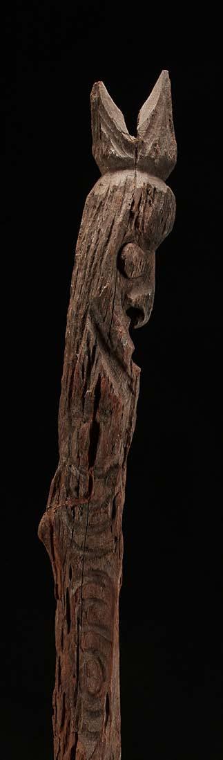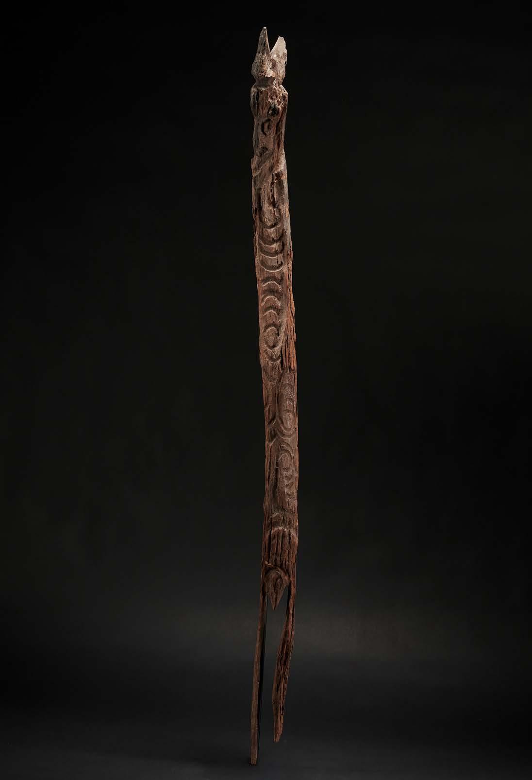 A large ancestral face, powerfully rendered, dominates the hook. Extending down the central axis, both front and back, is a long sinuous serpent motif. The serpents tail exits the mouth and undulates down the length of the form reinforcing the object’s strong verticality and finishes in a large, engraved head at the base, Serpents are deeply embedded in Iatmul cosmology, associated with ancestral power, transformation, and the life-giving forces of the Sepik River.