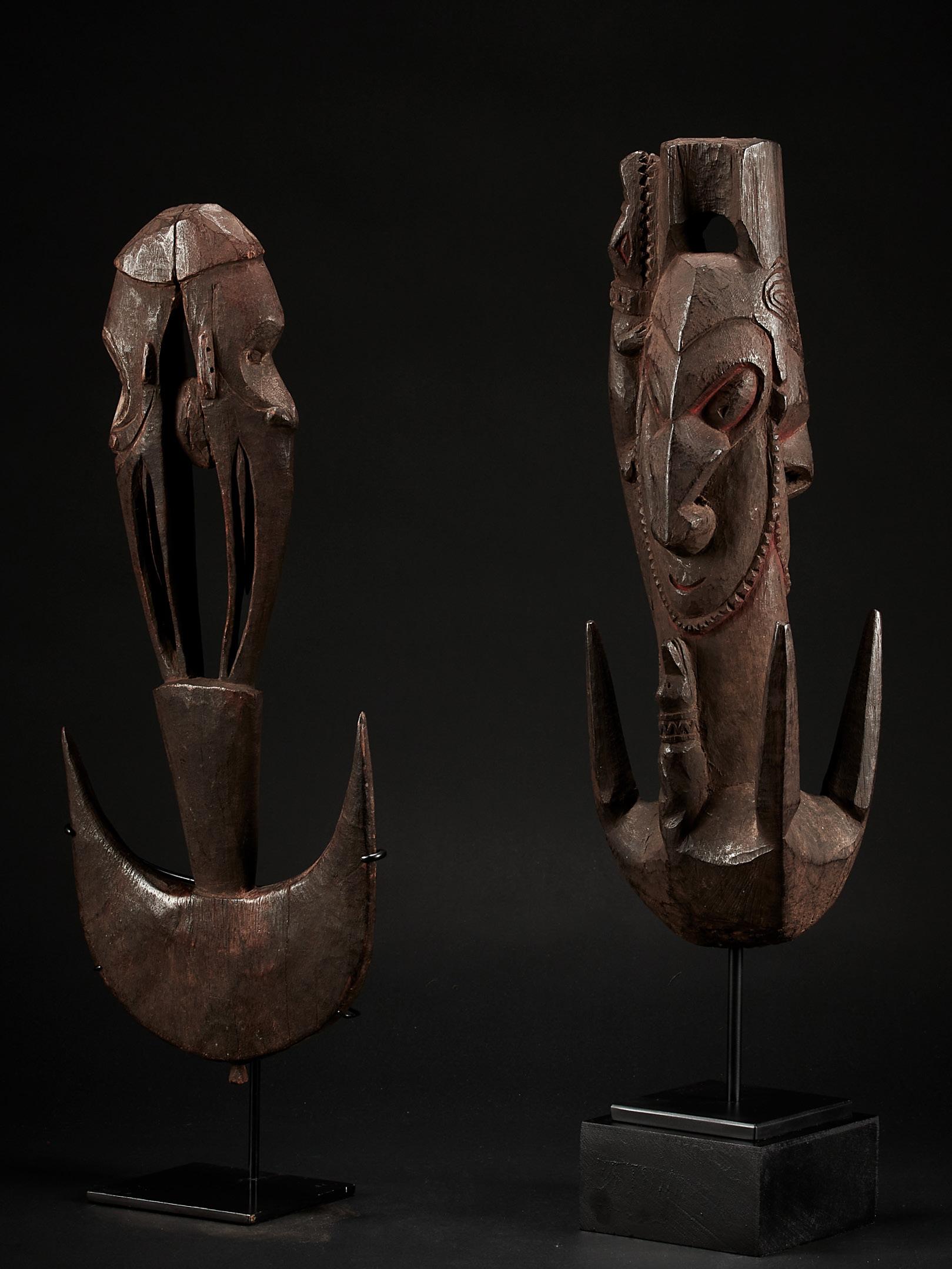 Attached to the sacred flutes, the flute music was the voice of this spirit mask. This form of oposing hooks continues westwards to the Karawari River system and as far as the Hunstein Mts. The mask is hardwood and old, certainly at least early 20th century.