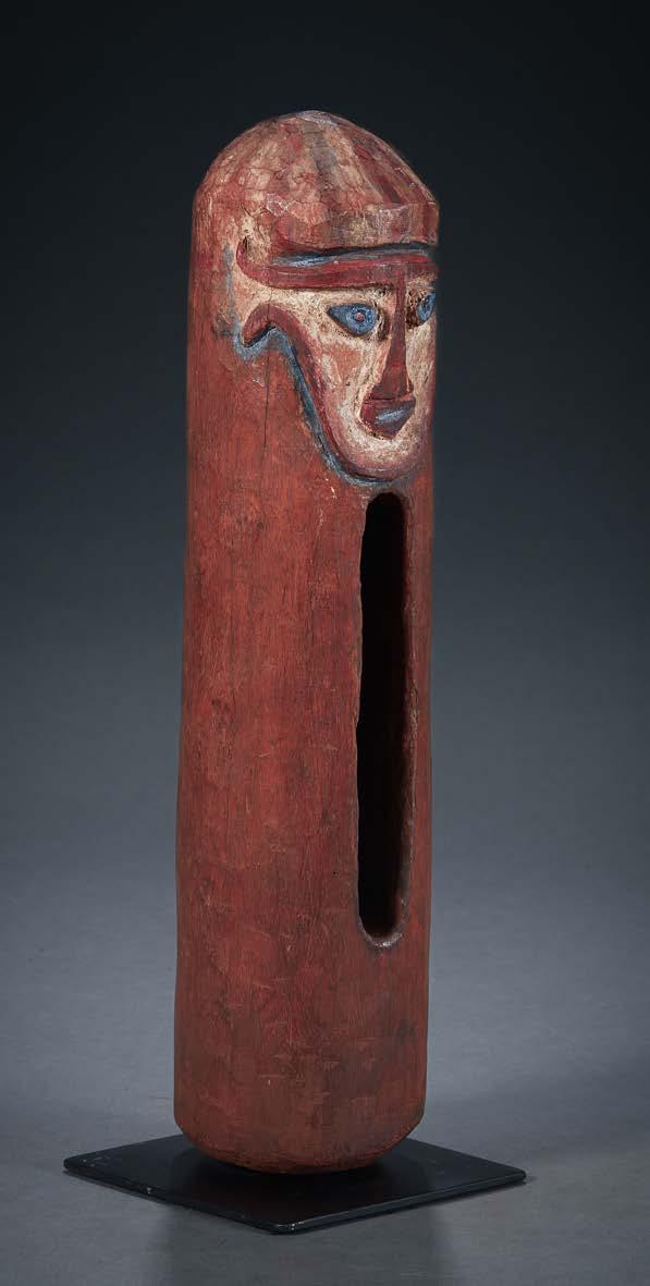 Such small slit gongs are quite rare. One very similar drum is shown in Felix Spicer's book, “Ethnography of Vanuatu” by Felix Speiser and was collected during his 1910-1912 research period on Malekula Island. Such small drums would be for personal use rather than for use in a large ceremonial context. This drum is obviously old; the face is beautifully and abstractly carved with a face and domed head very similar to the Spicer example. There are layerings of paint, some of which are enamel. When it was collected is unknown, but it found its way into a Melbourne collection.