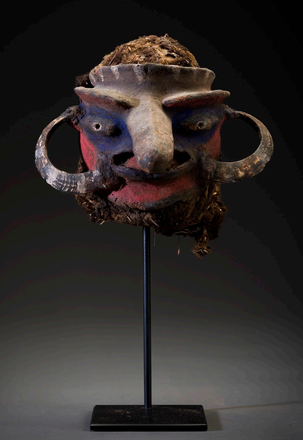 Evocative mask dominated by two important elements; its long nose and pig tusks. Made of clay and spiderweb with strong piercing eyes, and painted in bright blue and red pigments. Such masks were for display rather than worn on the face.