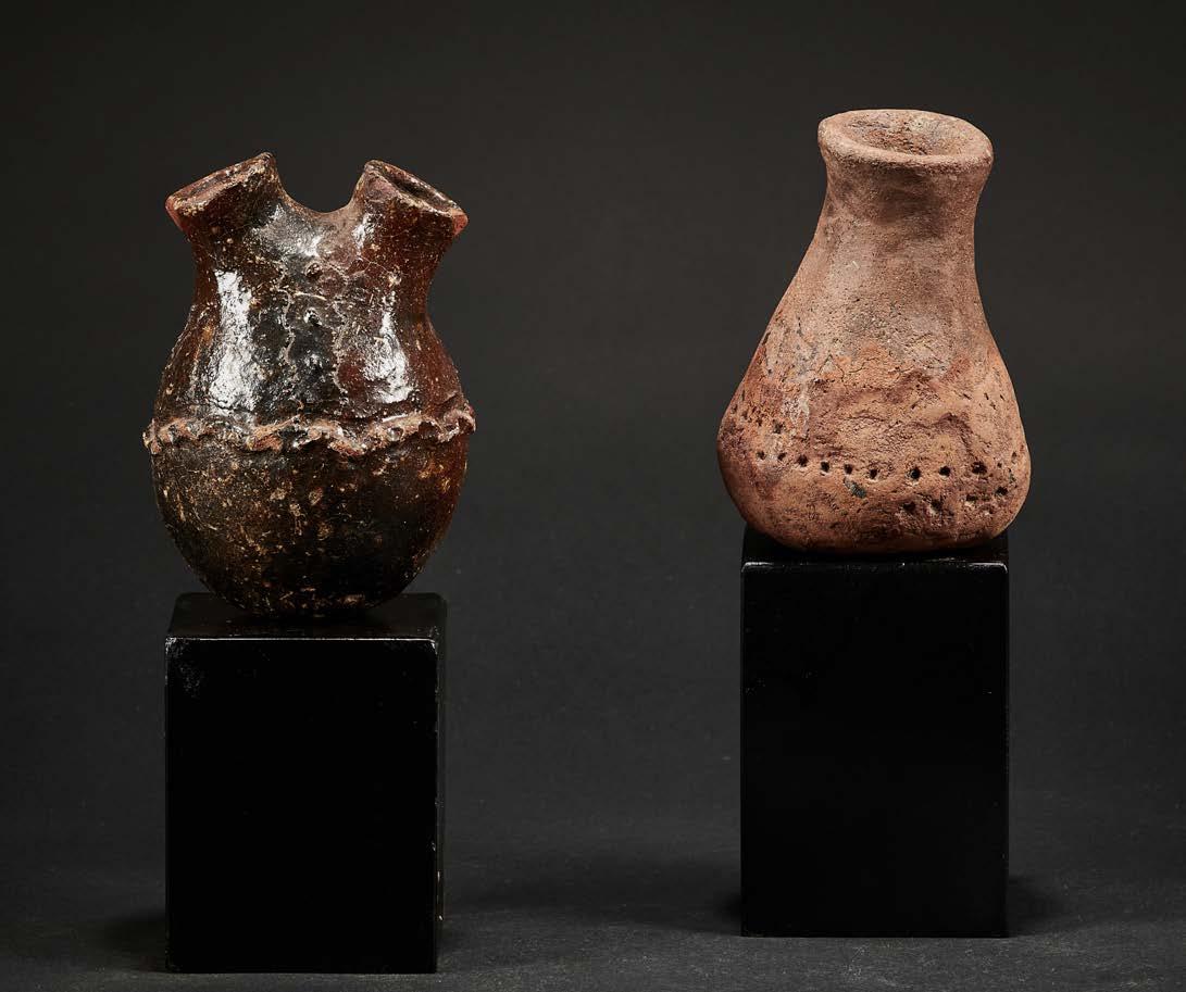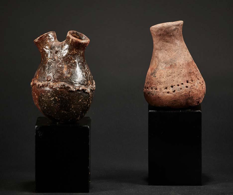 a) This Fijian pottery vessel is double-spouted and covered typically in a thick varnish-like coating. This coating gives a waterproof quality and an aesthetic quality valued by Fijians in ritual. Such pots may variously hold oil or water, depending on the ritual or specific use. Early 20th Century.