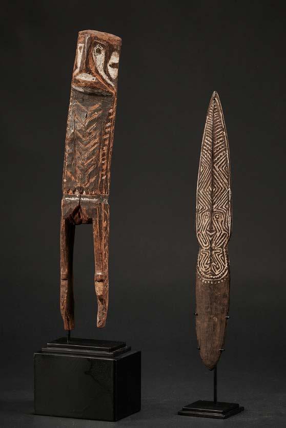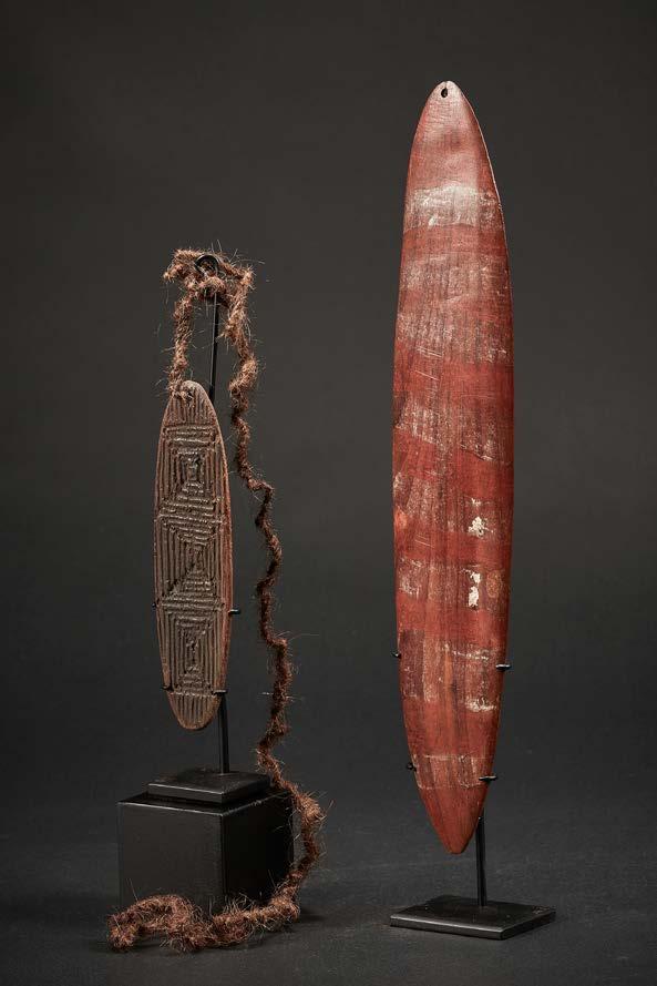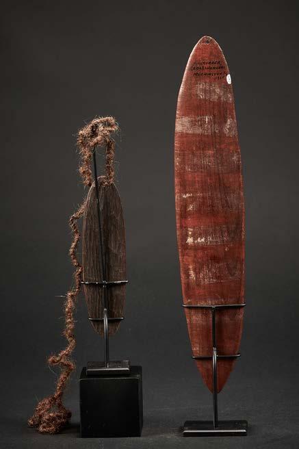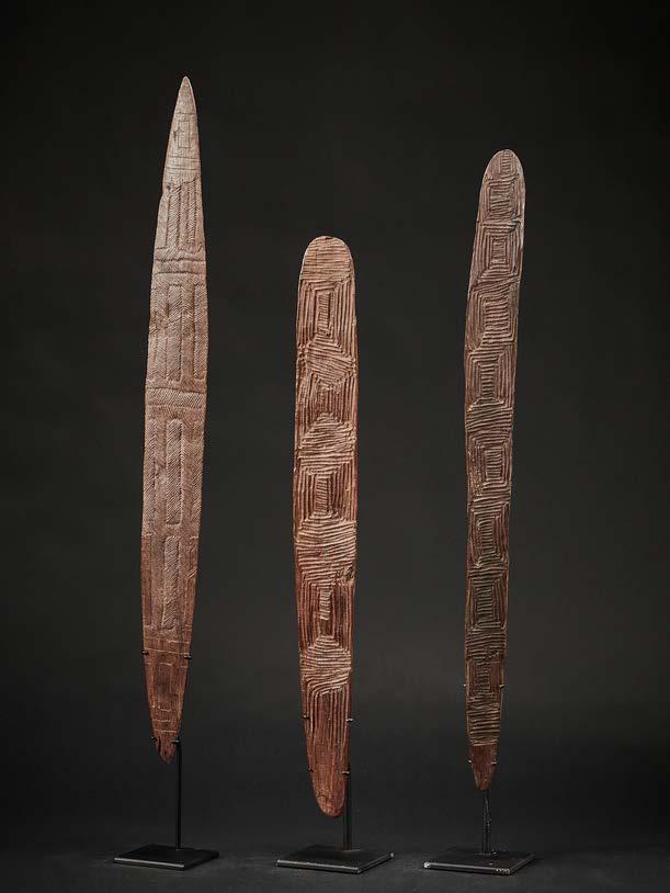 a) With sharp points at both ends, this churinga is completely covered in fine and delicate engraving with interlocking geometric forms. From La Grange Bay in Western Australia. 19th/early 20thC. Ex-collection William Dumal (1928-1996), number “029”, ex-Urimbirra Museum, Harvey Bay, Queensland.