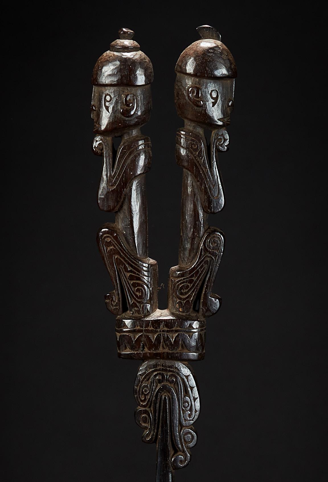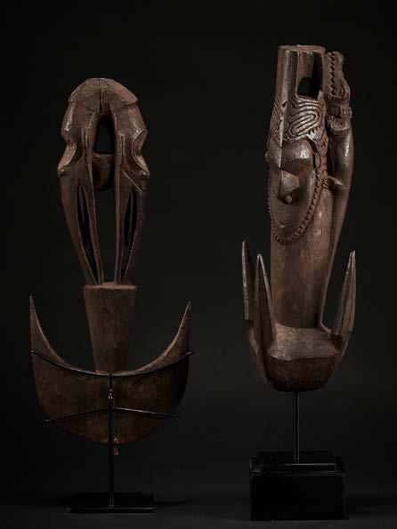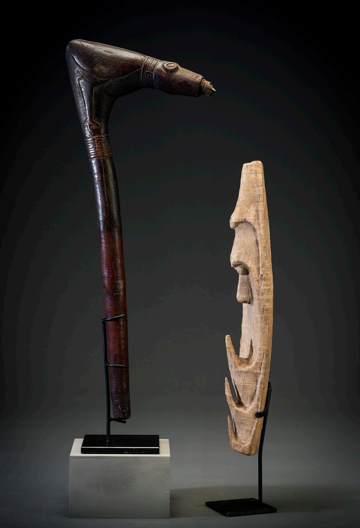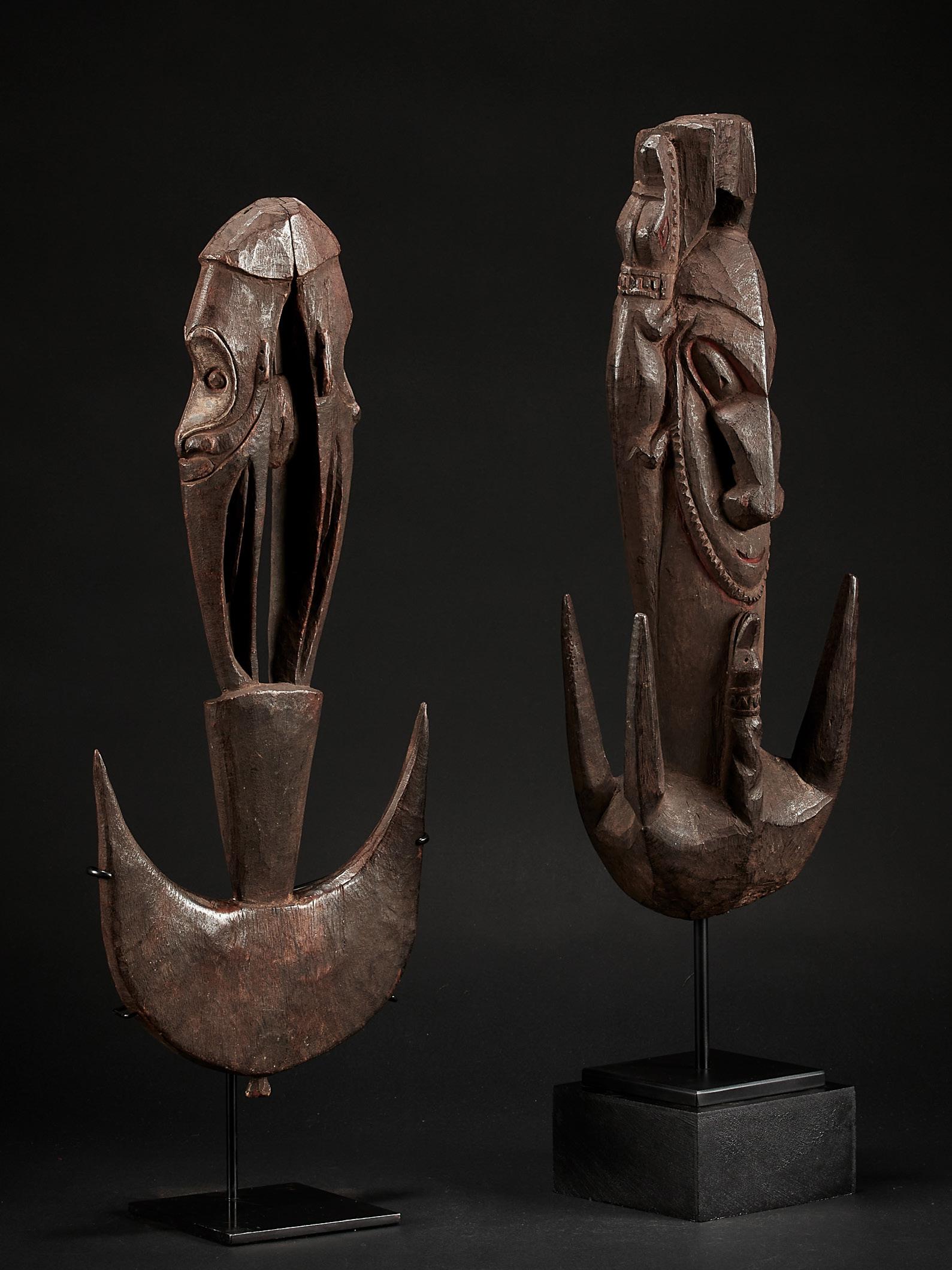 a) Basket Hook, Chambri Lake, Middle Sepik. Hooks from Chambri are recognised by their highly stylised central faces which face in opposite directions. This is an old hook figure, with two finely carved faces above a very elegant crescent shaped hook. The hooks have a deep patina from the constant hanging and removing of baskets over generations.