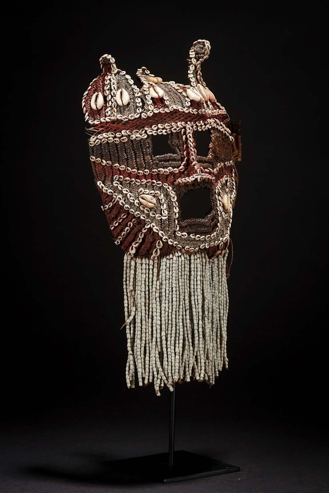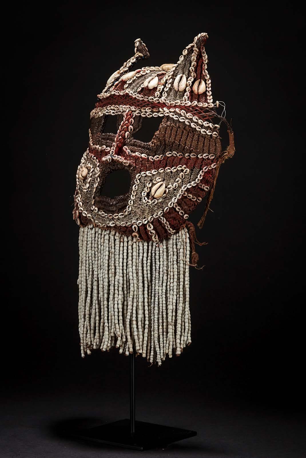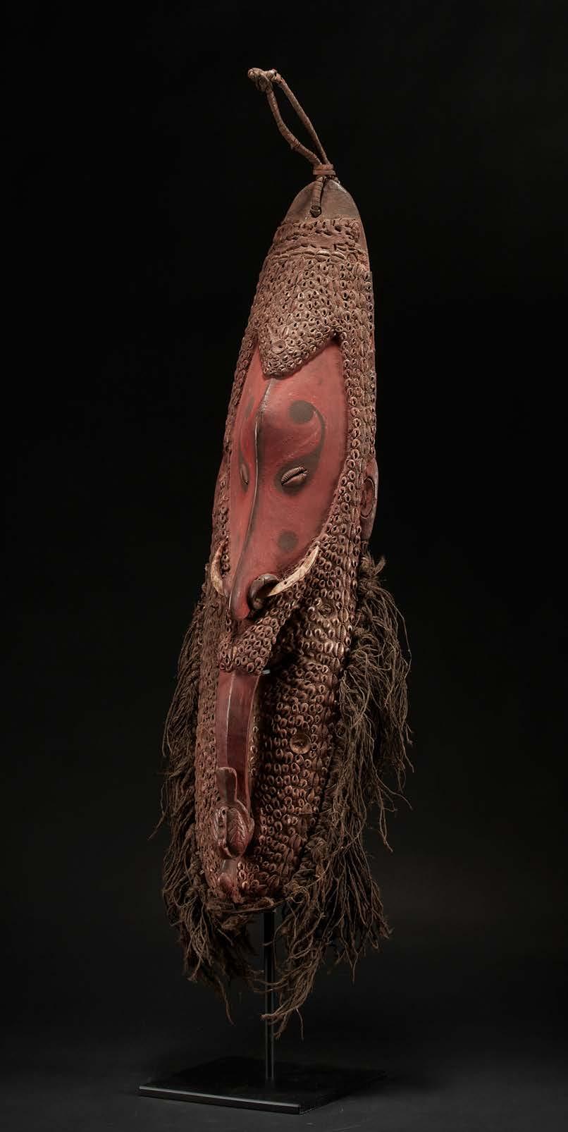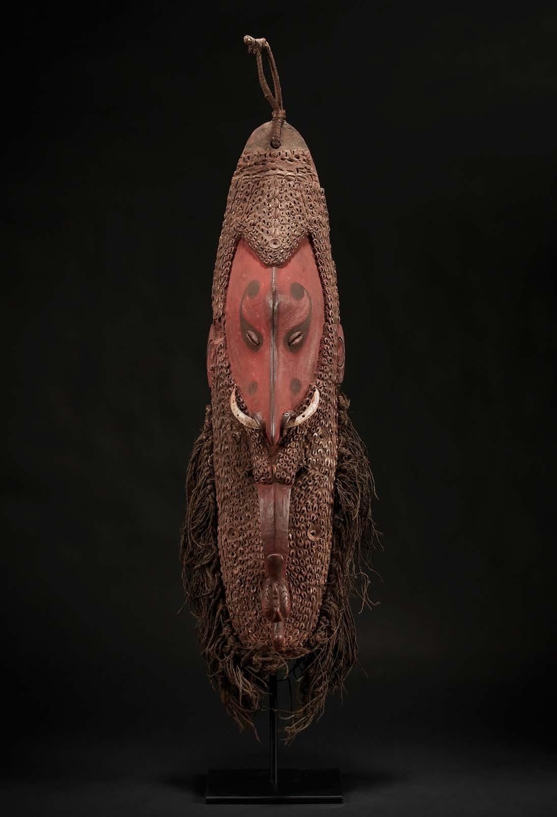 The Mwai (or Mai) mask of the Middle Sepik River is typically elongated. The red face is central with cowrie shell eyes and the nose decorated with matching pig tusks. Below the nose is an arched probiscis that merges into a totemic animal creature, which, in this case is a finely carved bird. The remainder of the mask is covered in a thick resilient clay and embedded carefully selected and matched nassa shells. The clay is carefully mixed with a tree oil ensure durability. Mwai masks are traditionally danced in pairs, representing the older and younger supernatural siblings. The mask is attached to the avan, a large woven basketry costume that completely covers the male dancers, transforming them into living embodiments of ancestral/spiritual power.