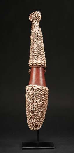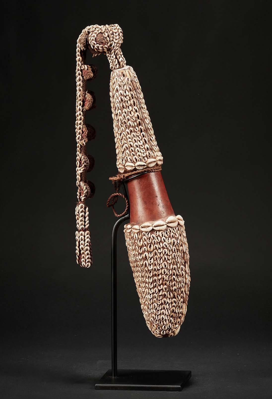 At this marriage ceremony, a bride traditionally wears an intricately woven veil adorned with shells while this decorated gourd constitutes the next most important object. This gourd is in perfect condition with both upper and lower parts covered with a resilient clay /oil mixture into which are embedded both nassa and cowrie shells – all carefully selected for matching form and sizes The lime stick is of cassowary bone, featureing a finely woven fibre overlay also decorated with cowrie and nassa shells, mirroring the bridal veil itself. Bridal lime containers of this quality are highly valued and often becoming heirlooms preserved for future use as the history of this pice so clearly shows.