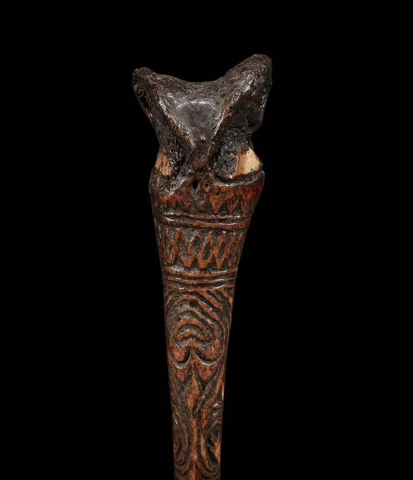 Deeply engraved with a deep honey-coloured overall patina. The central face is surrounded by typical Kwoma geometric and zig-zag motifs. The knuckle incorporates pearlshell “eyes”, very rare as two large cowrie shells invariably are embedded here. There are 9 matching notches below the engraved designs, the exact meaning unknown.