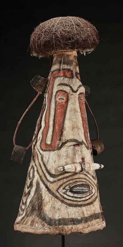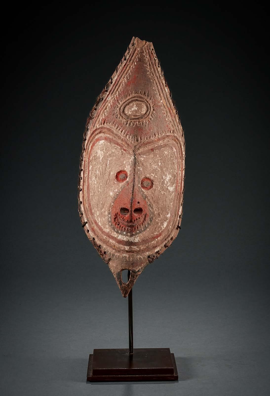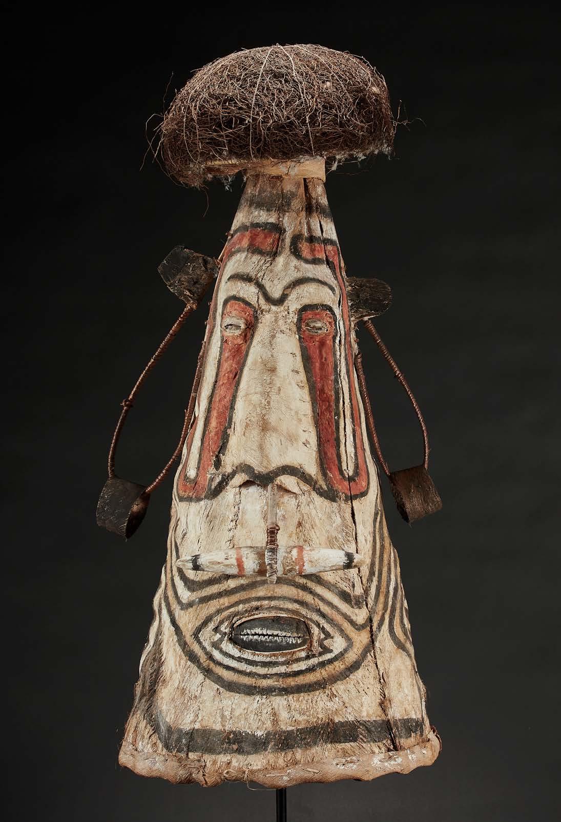 This early dance mask shows many of the bold sculptural elements that make Mundugumor sculpture so forceful. Reduced to a near-abstract triangular form, the mask possesses a strong graphic presence with an overall surface patina that shows age and sustained ceremonial use. Mundugumor mask features – the heavy brows, exaggerated nose and ears – are designed to intimidate and to assert spiritual potency within ritual contexts. Traditionally such masks are painted in pastel orange and pink colours in large blocks; here they have used the same colours but in vertical stripes. Compact in scale yet powerful in presence, this mask is a particularly evocative example of Mundugumor art, balancing abstraction, menace and its unique expression in a highly resolved form.