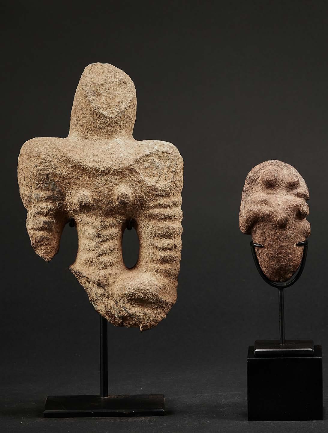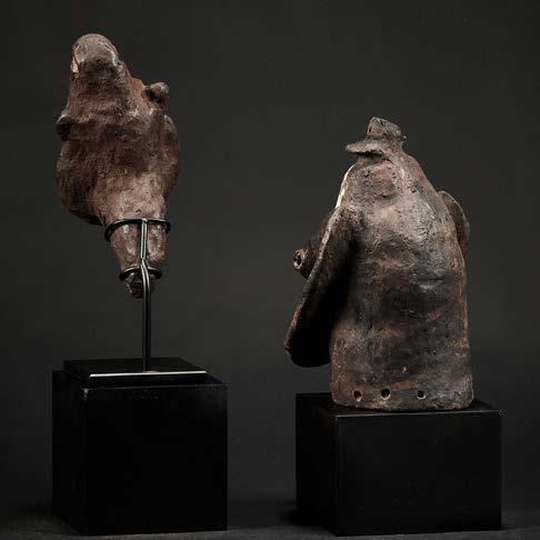 a) Old tightly woven with a strong bird-like visage and headdress above. The slightly twisted nose lends the form a sense of vitality and presence.
