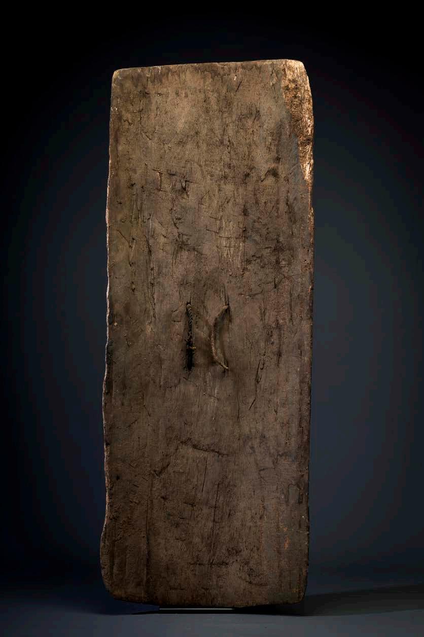 This ancient shield is pre-contact and has more than a dozen arrow points, or arrow holes, from generations of tribal fighting. The size and proportions suggest it originated in the western regions of the Wahgi Valley where shields were typically smaller than those produced in the larger, wider valley systems of the central and eastern Wahgi Valley. It has the slight curve almost always found on these old shields. Two holes at the top were for a feather decoration secured by the warrior before warfare. In the central area are four small holes used to secure the carrying sling with cane binding through the shield.