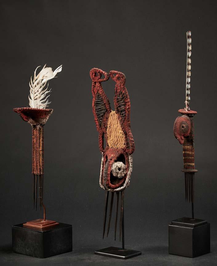 Basket hooks along almost the entire length of the 700km Sepik River are carved from wood, with two or more hooks that carry baskets of food or woven bags holding valuables, principally to keep them out of reach of rats and insects. Importantly, these basket hooks also have figures, faces or totemic animals as the greater part of their form that are protective against evil spells and spirits.