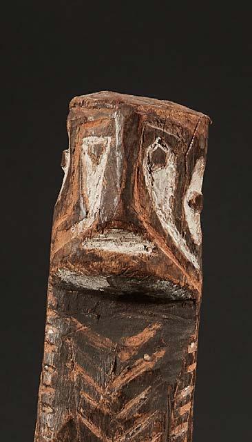 Kanganaman village is renowned for the fine workmanship of their carved forms, particularly the carved basket hooks, called samban in the Iatmul language. This finely executed example represents an important accomplished work, distinguished by its assured carving, balanced proportions and refined surface detail. There is no doubt it was carved by an older master carver of Kanganamon and dates to the 1940s-early 1950s.
