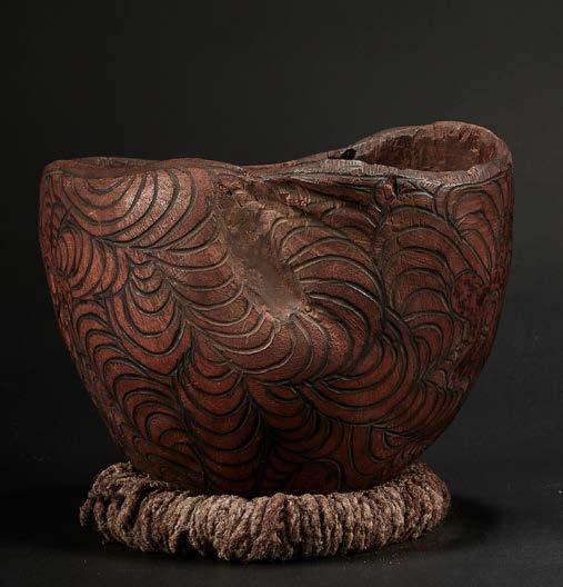 This unusually large deep wooden bowl originatesd from the Central Desert region of Australia and made by the Pitjantjara people. The exterior is entirely covered with curvilinear engraved motifs which relate particularly to water and its symbolic importance. The bowl sits on a thick ring of twined human hair.
