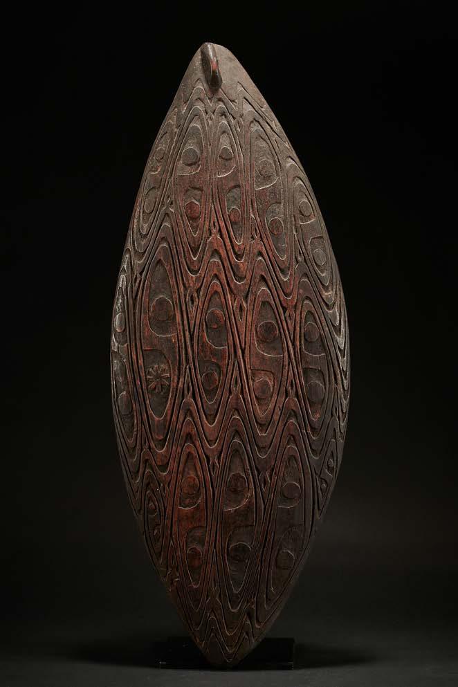 This is an early shield most probably carved after contact as it shows use of steel; but it is early and the design motifs have that archaic feel. The geometric motifs are outlined with very fine punctated holes. Shields of the Wahgi Valley are certainly among the largest shields in the world; two or three warriors with bows and arrows can hide behind a single shield.