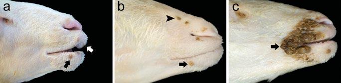 Figura 1. Corderos lactantes infectados experimentalmente con ORFV. a) Primera fase del ectima contagioso (EC) (2-5 días postinfección): pápulas (flecha marrón) y vesículas (flecha blanca) en la comisura labial. b) Segunda fase del EC (5-12 días post-infección): pústulas (flecha) y costras (cabeza de flecha) en el hocico. c) Tercera fase del EC: dermatitis proliferativa en la comisura labial (flecha).