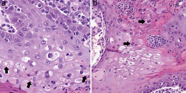 Figura 3. Corderos lactantes infectados naturalmente con ORFV. a) Dermatitis proliferativa con cuerpos de inclusión eosinofílicos intracitoplasmáticos en los queratinocitos (flechas). b) Dermatitis pustulosa con cuerpos de inclusión hipereosinofílicos intracitoplasmáticos en los queratinocitos (flechas).