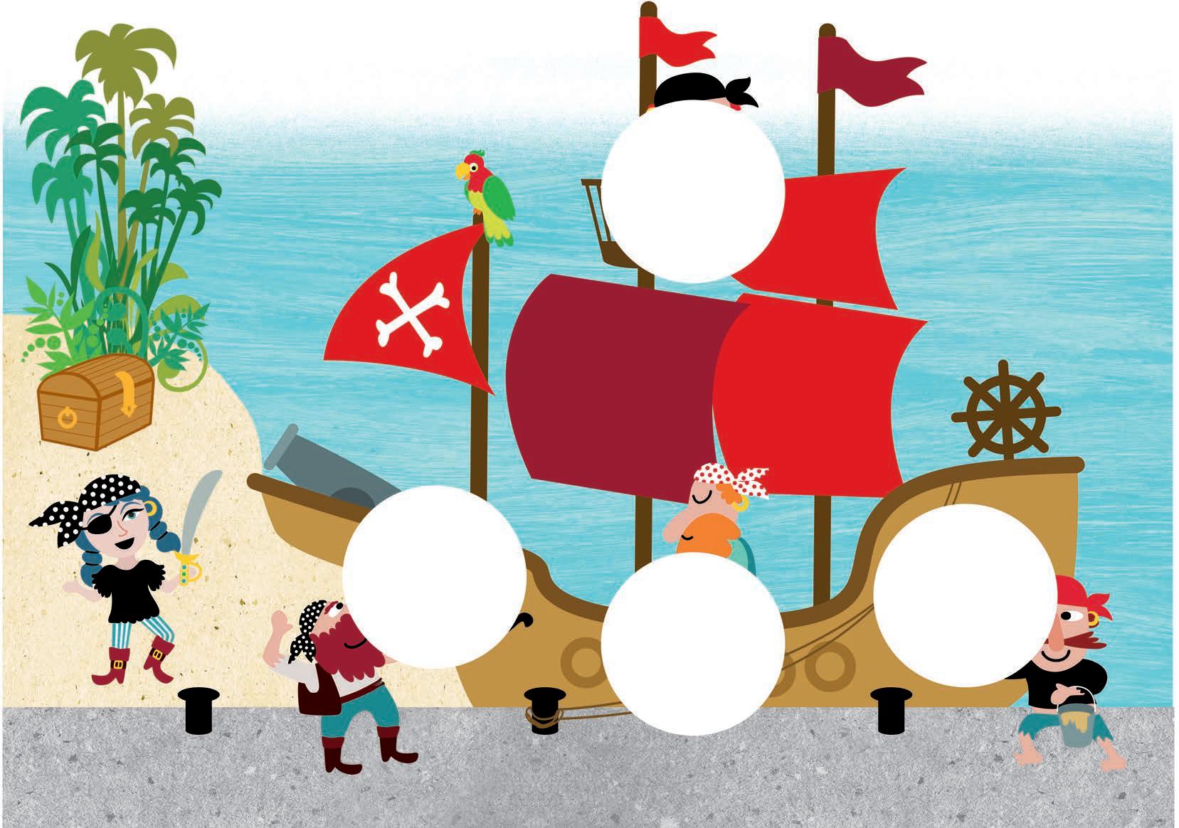 Colocar en los cofres los adhesivos que corresponda para que todos los piratas reciban el mismo botín.
