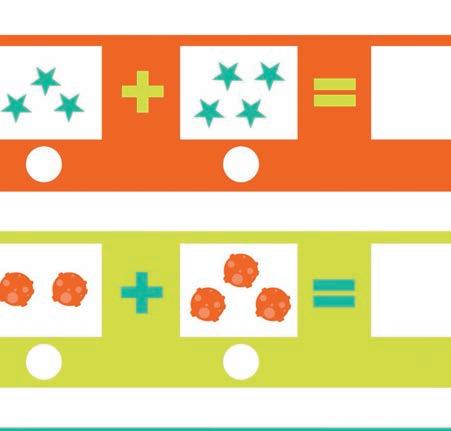 Resolver las sumas: contar los elementos de cada grupo y escribir el número. Crear su propia suma con los adhesivos de cometas y de los signos.