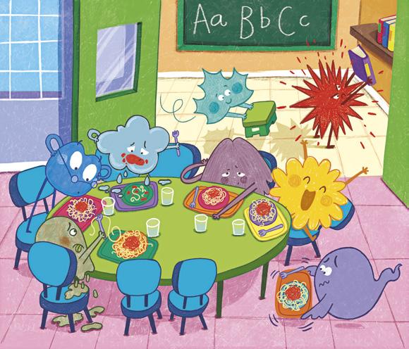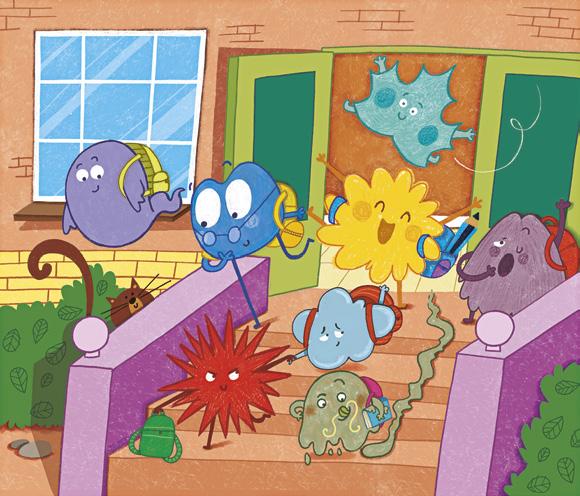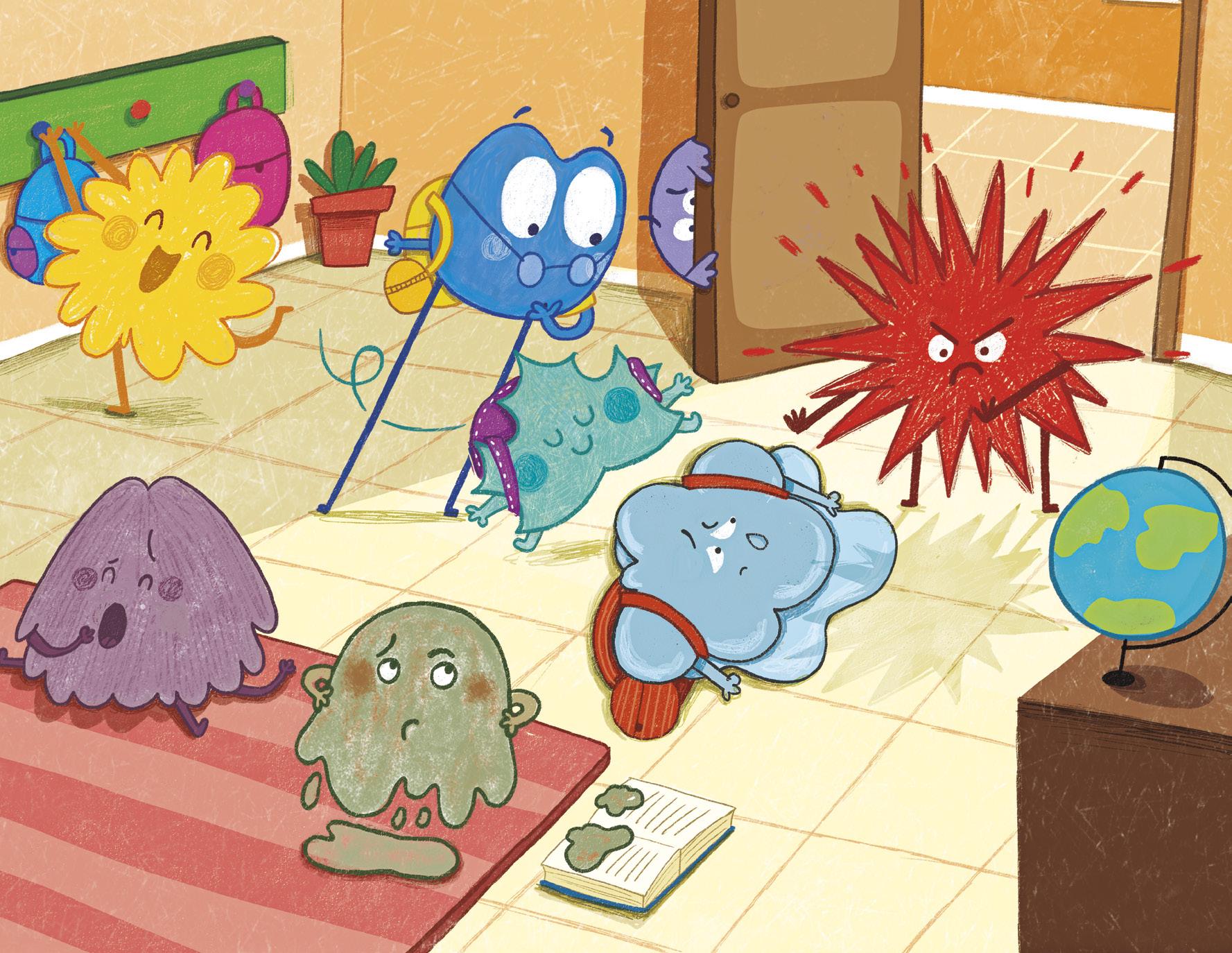 Allí estudian, Alegría, que no para de saltar y lanza purpurina cuando está muy contenta. Tristeza, que va haciendo charcos. Miedo, que a veces se esconde porque se asusta. Calma, que flota tranquila como si volara llevada por el viento. Asco, que es verde y muy pegajoso. Enfado, que a veces suelta chispas. Sorpresa, que se sorprende por todo y se le abren mucho los ojos.Y también Aburrimiento, que camina despacito arrastrando su mochila.