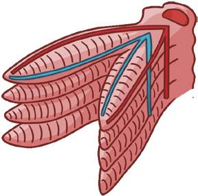Las branquias son conjuntos de láminas por las que circula el agua rica en oxígeno. Estas láminas están en contacto con los vasos sanguíneos, por los que el oxígeno pasa a la sangre, que la transporta a todo el animal.