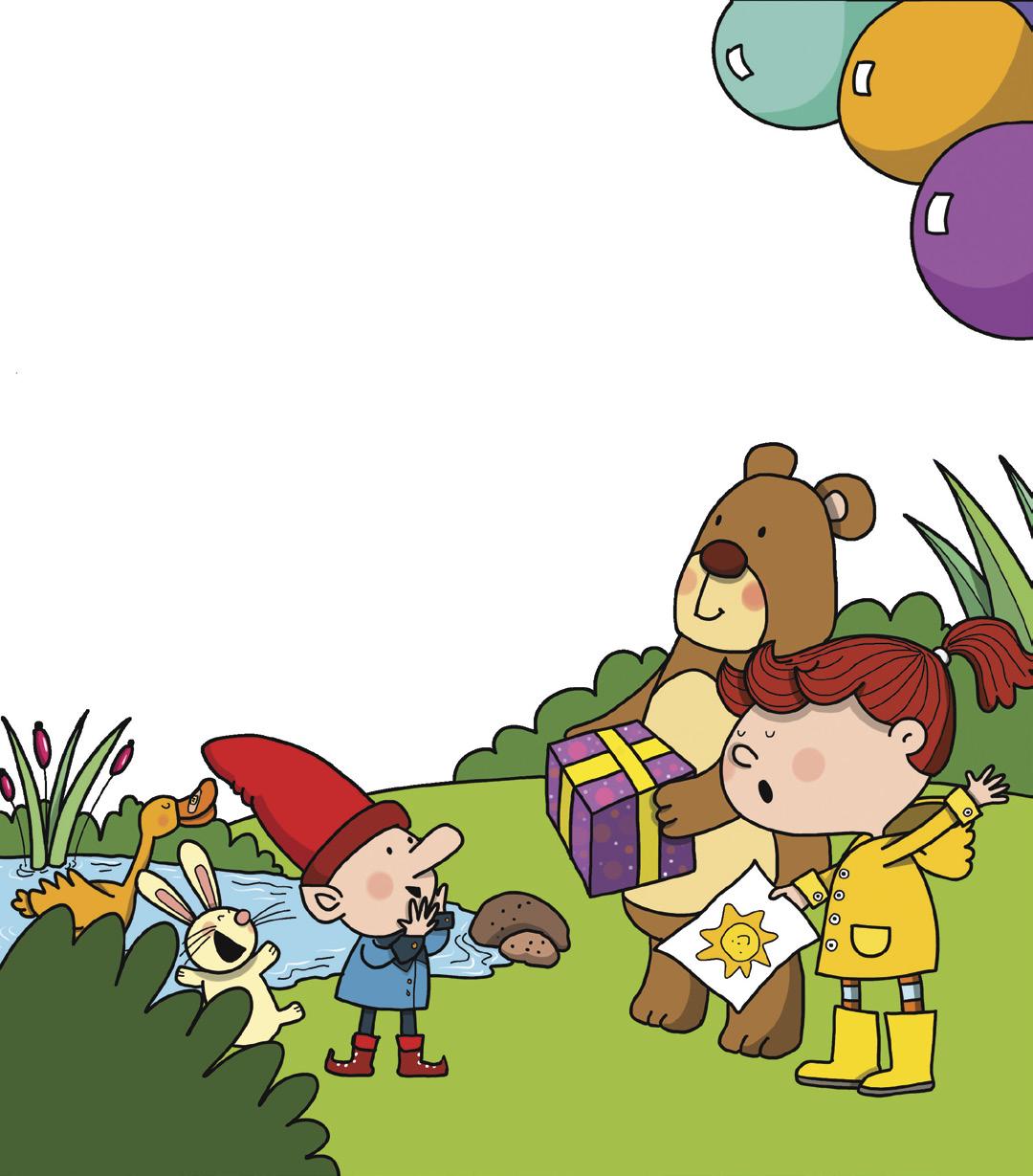 Las ranas formaron una orquesta. El oso Quique le entregó un paquete y Camila le regaló un dibujo y una poesía: