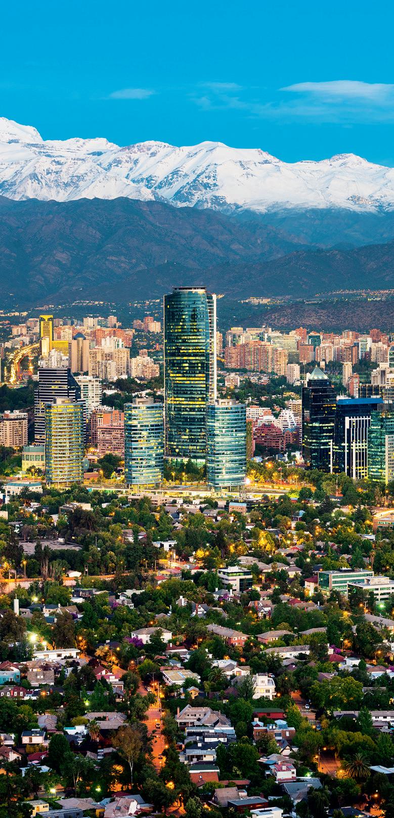 Es la capital y la ciudad más grande de Chile. Está en el centro del largo país, rodeada por las montañas de la Cordillera de los Andes y cerca del océano Pacífico. Tiene plazas, parques, museos, centros comerciales y restaurantes típicos. Se puede pasear, visitar el cerro San Cristóbal, probar comida típica y disfrutar la vibrante vida nocturna.