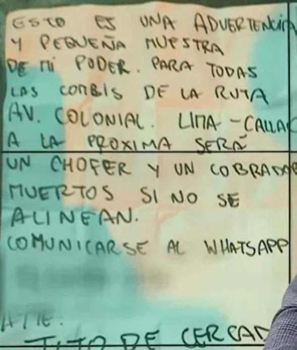 amenazas iban dirigidas a todas las combis de la ruta Colonial e incluía un número de WhatsApp para concretar el pago de cupos. Según el testimonio del afectado, la empresa habría estado pagando S/10 diarios para