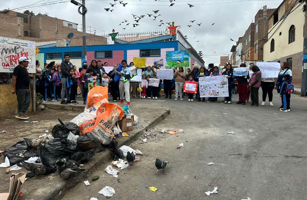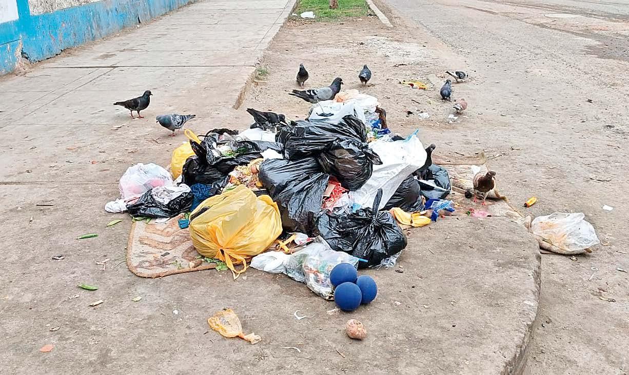 Los vehículos deben maniobrar hasta casi subir a la vereda para evitar salpicar aguas contaminadas. Peor aún, a pocos metros funciona una institución educativa: niños que salen de clases se topan con charcos pestilentes y una esquina usada como basurero, pese a que un cartel advierte la prohibición. Allí, montículos de desperdicios atraen palomas y ratas, otro foco de infección.