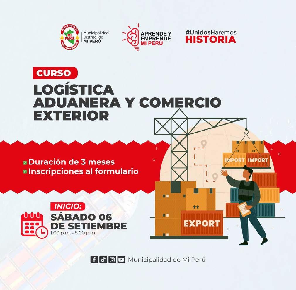 El Curso Técnico de Logística Aduanera y Comercio Exterior forma parte del programa Aprende y Emprende. La Municipalidad de Mi Perú, bajo el liderazgo del alcalde Irvin Chávez León, impulsa esta iniciativa que busca capacitar a jóvenes y adultos en un área clave del comercio internacional, formando especialistas capaces de gestionar operaciones de importación y exportación, optimizar costos y generar nuevas oportunidades de negocio en un mercado cada vez más competitivo. Las clases tendrán una duración de tres meses y se dictarán todos los sábados desde el 6 de septiembre, en el horario de 1:00 p.m. a 5:00 p.m. Los interesados en participar podrán inscribirse o solicitar mayor información a través de los números 952 793 865 y 902 613 437.