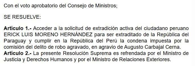 El Poder Ejecutivo aprobó la extradición de Erick Luis Moreno Hernández, alias “El Monstruo”, desde Paraguay, a fin de que cumpla en el Perú la condena que pesa en su contra por el delito de robo agravado. La decisión fue oficializada mediante la Resolución Suprema N.° 1692025-JUS, publicada este jueves 28 de agosto en el diario oficial El Peruano, y lleva la firma de la presidenta Dina Boluarte, el presidente del Consejo de Ministros, Eduardo Arana, y el ministro de Justicia, Juan José Santiváñez. Según el documento, la solicitud fue presentada por el Décimo Cuarto Juzgado de Investigación Preparatoria de la Corte Superior de Lima Norte y declarada procedente por la Sala Penal Permanente de la Corte Suprema. Moreno Hernández deberá responder por el robo agravado en agravio de Augusto Carbajal Cerna, en un trámite sustentado en el Tratado de Extradición vigente entre Perú y Paraguay desde 2005, así como en el Código Procesal Penal y el Decreto Supremo N.° 015-