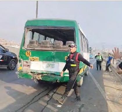 rando el triple impacto. Producto del choque, tres pasajeros del bus resultaron heridos: un adulto mayor y dos jóvenes —un varón y una mujer— quienes sufrieron golpes y cortes leves por la rotura de vidrios. Paramédicos llegaron de inmediato para brindar atención médica y confirmaron que los afectados se encuentran estables. Las unidades involucradas presentan severos daños materiales. El bus, de placa A3M-711, quedó con la parte posterior hundida